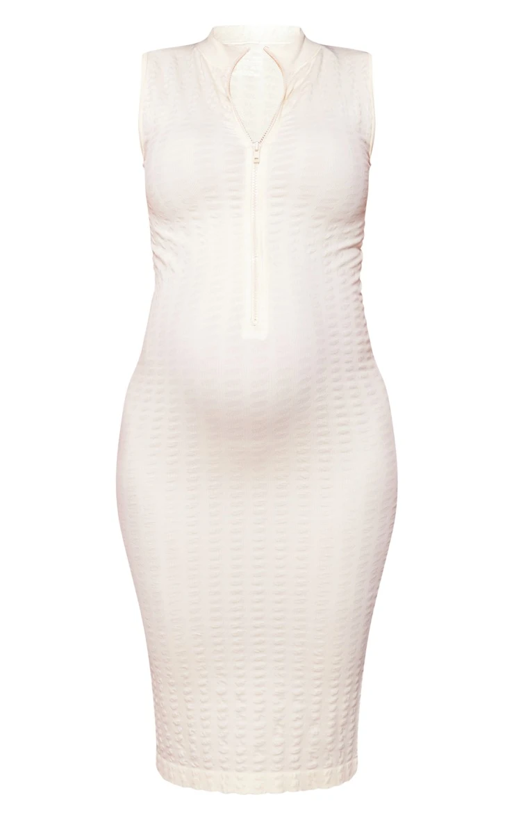 Make everyday styling simple with this maternity beige textured contour rib midi dress, you’re sure to be showing off your luxe side whatever the occasion. This midi dress features a beige textured rib material with a zip front detail and a contour design that is perfect for flattering your shape, how could you not be in love? Team this maternity midi dress with your fave sandals and simple accessories for a flawless finish.