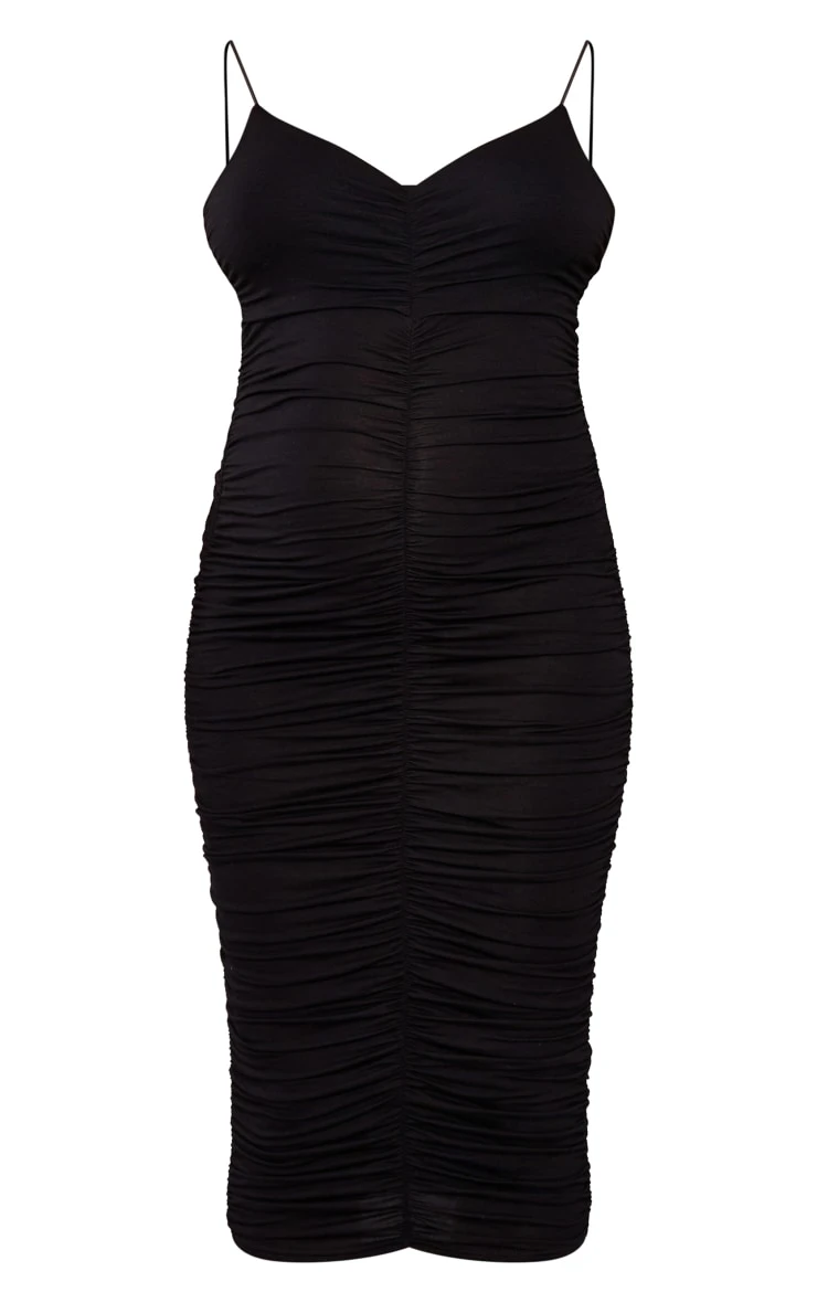 Give your wardrobe a seriously chic update with this dress. Featuring a black jersey material with a plunge design and a midi length. Style with some strappy heels and a statement bag for a look that’s perfect for that upcoming event.