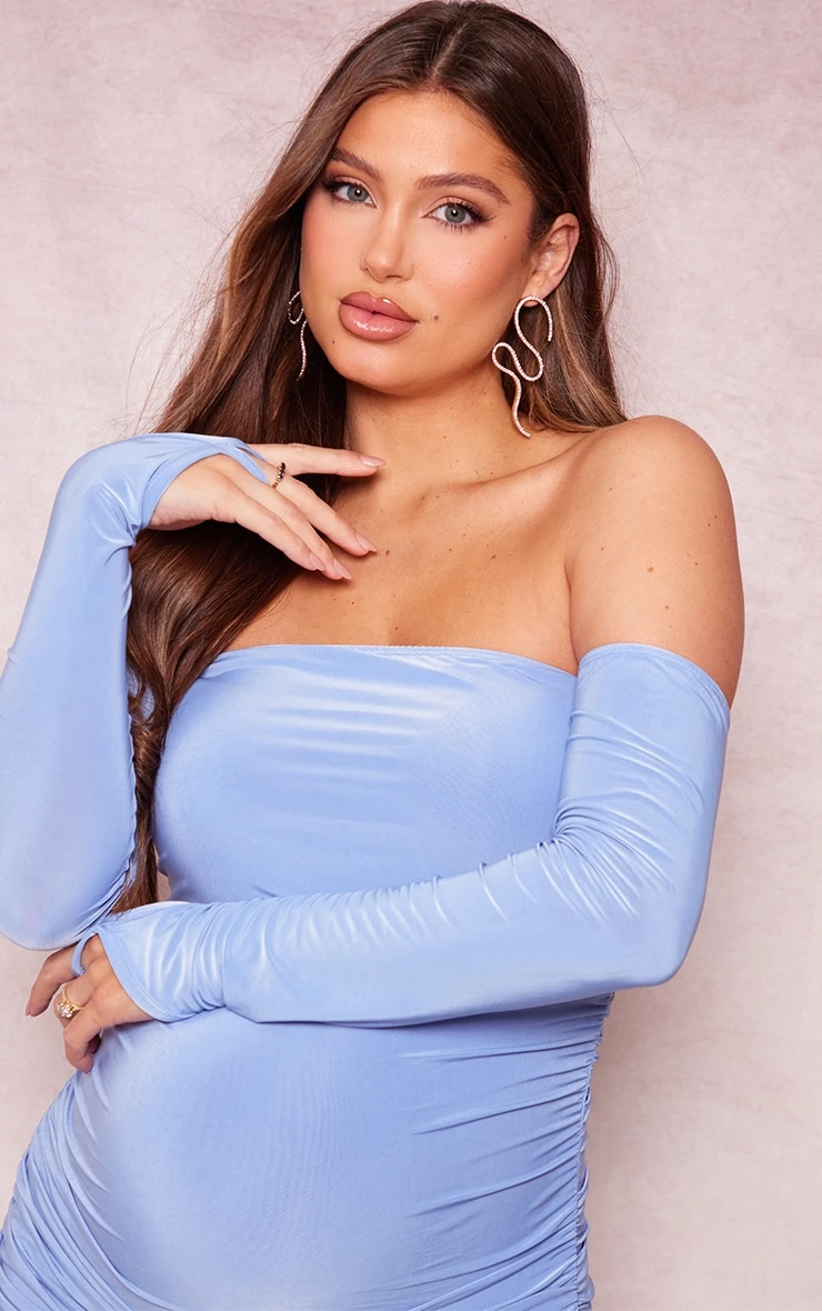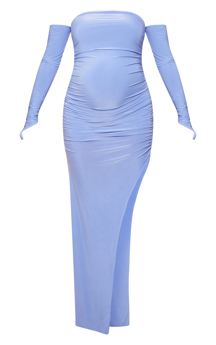 Take the stress out of weekend styling with this unreal maternity blue slinky off the shoulder ruched maxi dress . This maternity dress is brought to you in a blue slinky with material with an off the shoulder design, ruched detailing and a maxi length, you really can’t go wrong with this maxi dress doll. Style with clear strap heels and gold accessories for a look that will have eyes on you for all the right reasons..