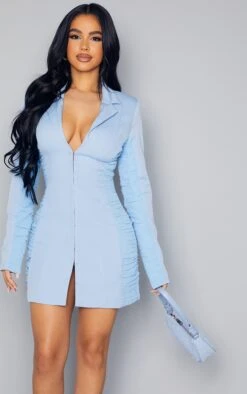 Add pastel hues into your weekend wardrobe with this dress doll. Featuring a blue material with ruched detailing and a figure-flattering fit, what’s not to love? Style with matching hue accessories and mules for a night out with the dolls.