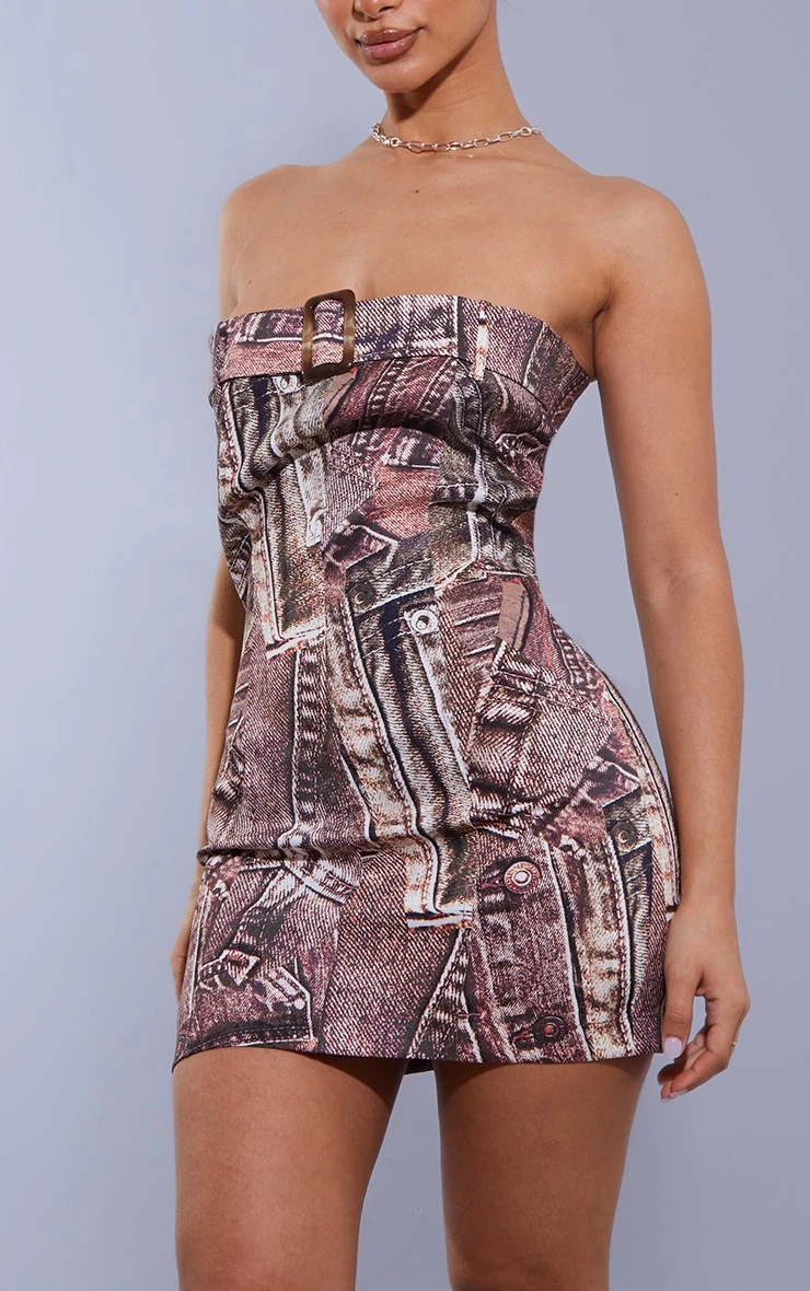 This petite brown denim print buckle front mini dress is sure to add some drama to your new season wardrobe. This unreal dress is brought to you in a brown hue with a denim print design that will add a little edge to your outfit. With a buckle front detail, and a mini length, this dress is sure to have heads turning. Team with some clear heels and a mini bag for a look that will earn you some real styling points.