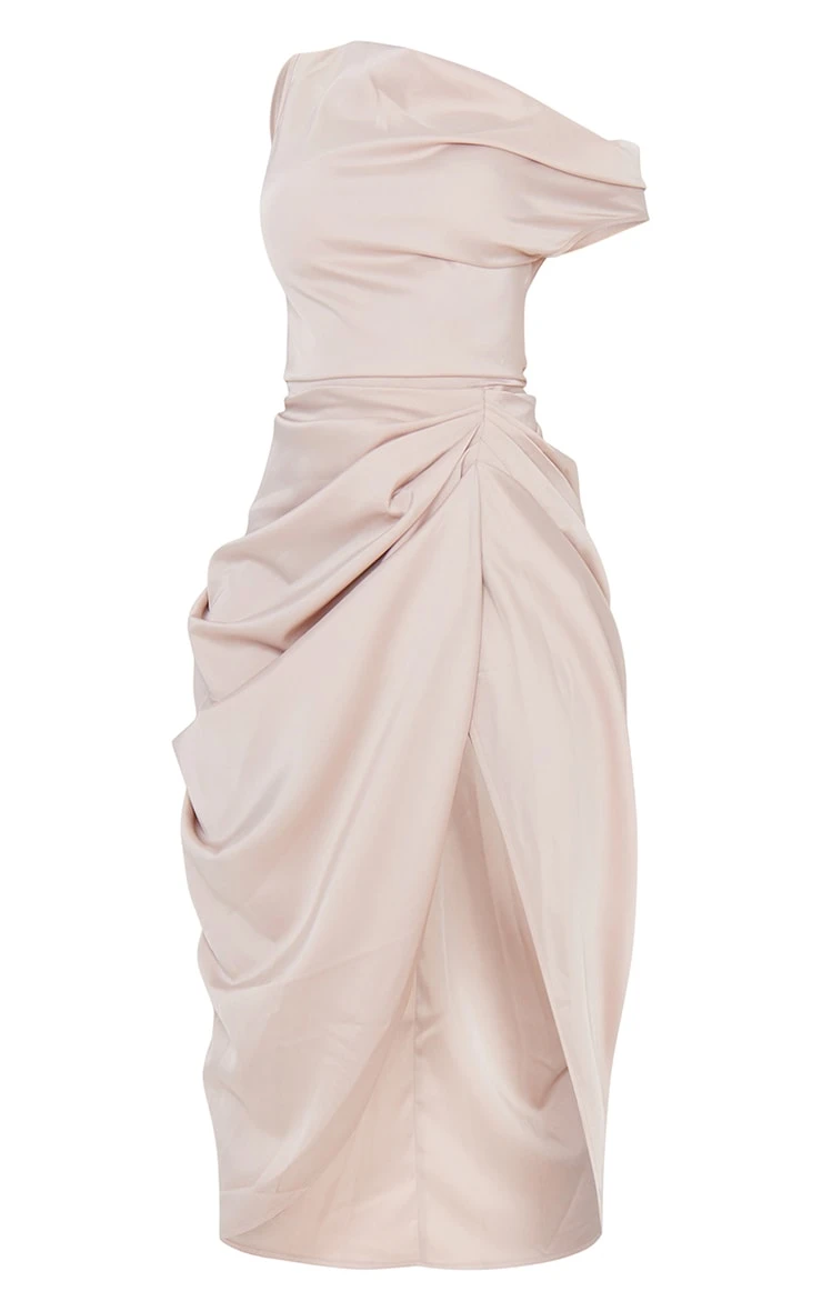 Got an important occasion coming up? Then this dress is a must. Featuring a champagne satin material with an off the shoulder design and draped skirt, we’re in love. Wear with your go-to heels and sparkly accessories for a glam finish.