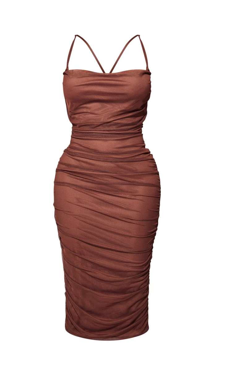 Channel all the luxe vibes into your weekend wardrobe with this dress. Featuring a chocolate material with a cowl neckline, ruched detailing and a midaxi length, we’re obsessed. Style with tie-up heels and simple accessories to have all eyes on you.