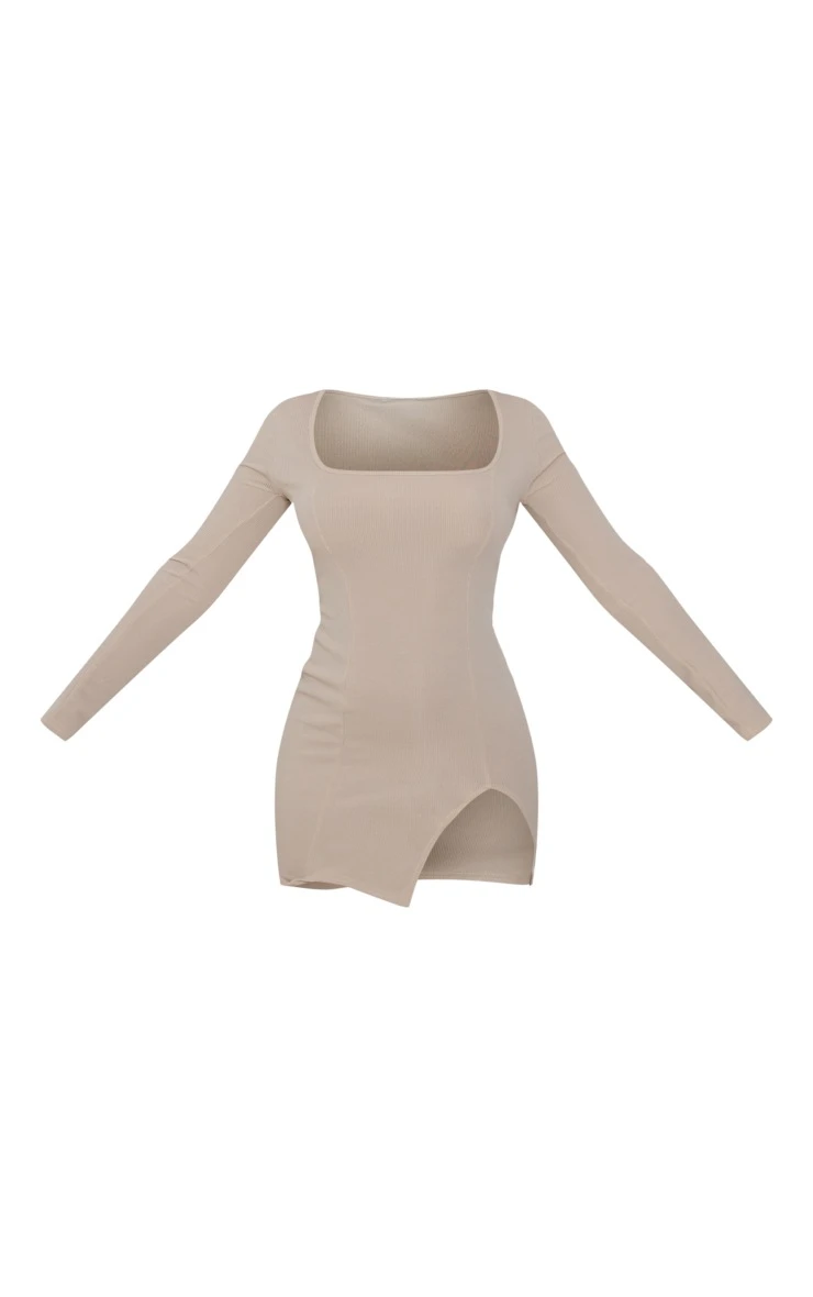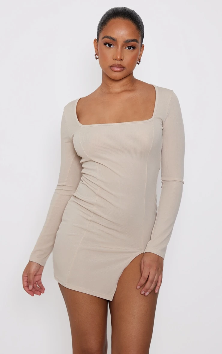 Make weekend styling simple but chic with this dreamy petite cream ribbed split hem square neck long sleeve bodycon dress, get ready to add straight to your basket. It is made with a cream hue ribbed material with a split hem design, a square neck and long sleeves, what’s not to love? Team with tie-up heels and simple hoop earrings for a look that is perfect for a night with the dolls, it’s a yes from us.
