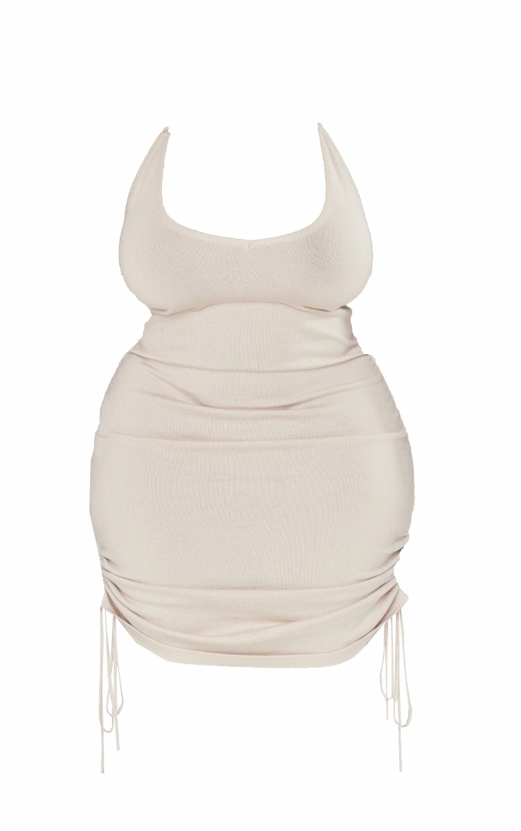 Make them stop and stare in this plus beige ruched V neck strappy knitted dress. A must-have for your weekend wardrobe doll, this knitted dress is perfect for a night with the dolls. Made from a beige knitted material with a V neckline and ruched detailing, what’s not to love? Style this beige dress with clear strap heels, statement accessories and a mini bag to elevate the look.