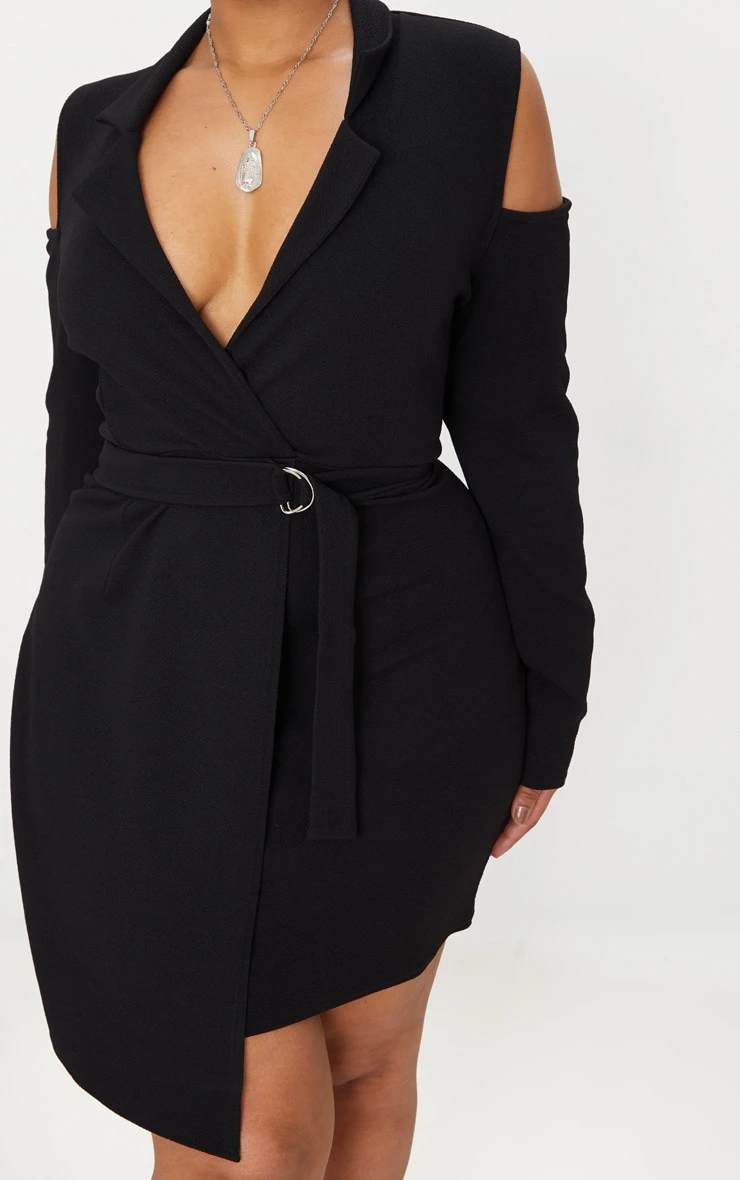 Add this blazer dress to your LBD collection for a new chic addition. Featuring a black stretchy fabric, cold shoulder sleeves and a belted waistline with a ring fastening, team it with some strappy heels for a night out with the girls.