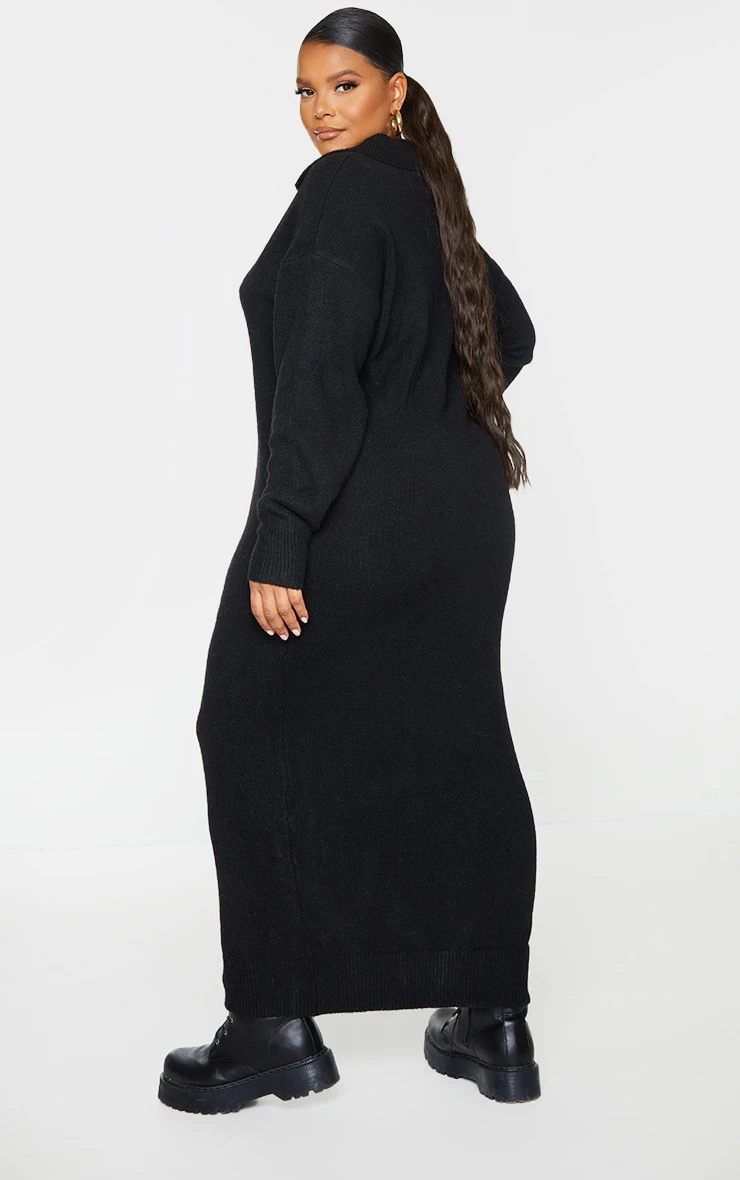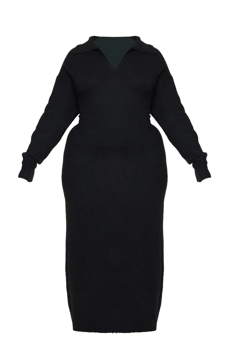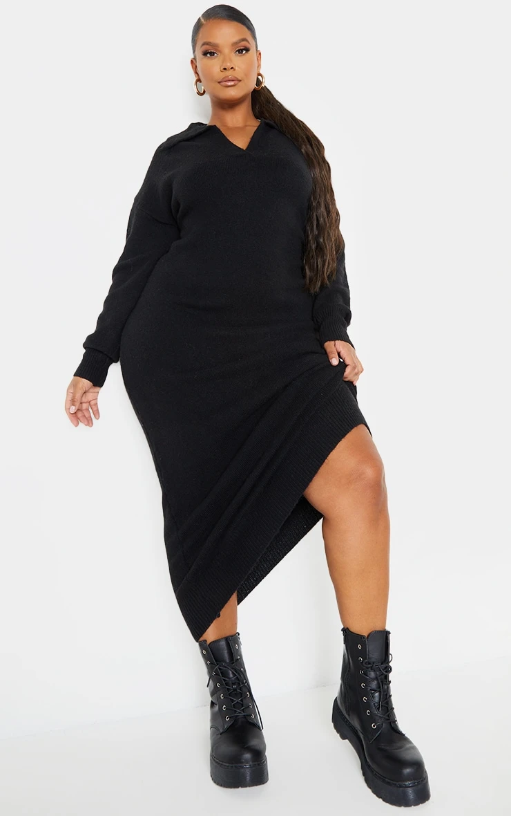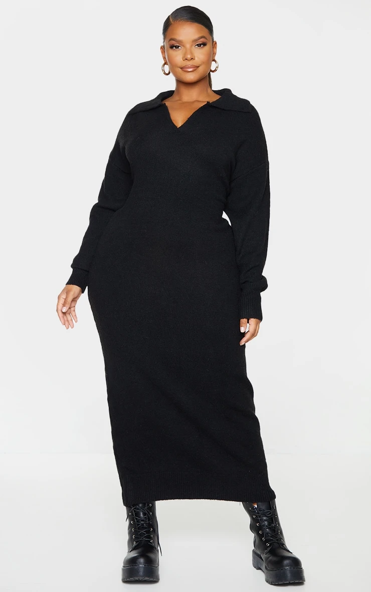 Get maxing out your new season wardrobe with this dress. Featuring a black knitted material with collar detail and long sleeves, we’re in love. Wear with chunky boots and hoop earrings for a seriously chic look.