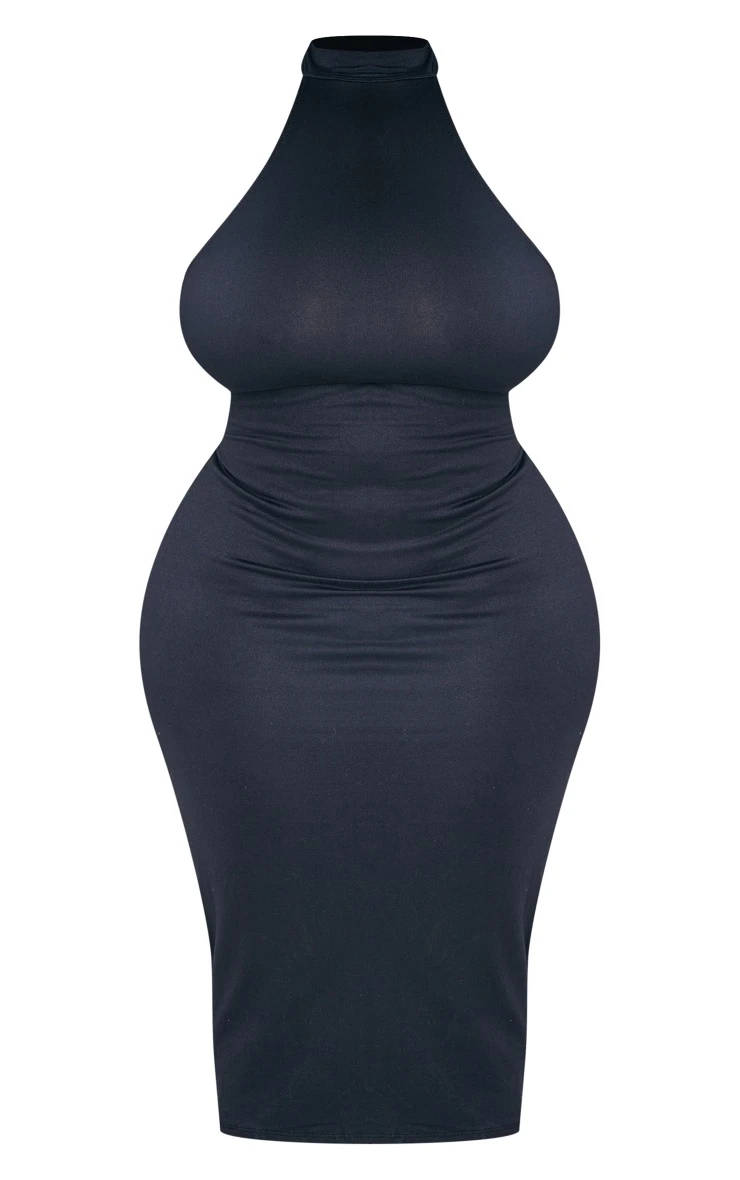 Get that effortlessly chic look this weekend with this plus black high neck midi dress. Whether you have a special occasion in your diary or a date night with the dolls planned this midi dress is a perfect choice. With a black hue material that is seriously flattering, a high halterneck design and a midi length, how could you say no? Style with clear heels, a bold mini bag, and staple accessories for a dreamy finish.