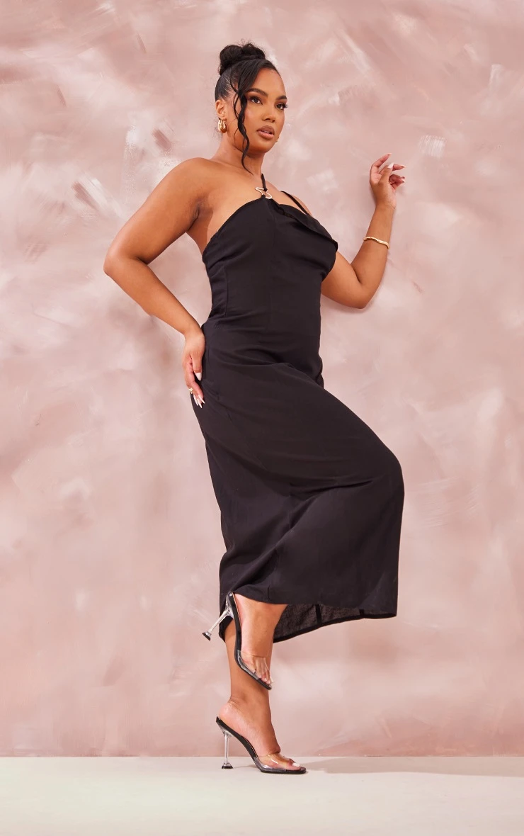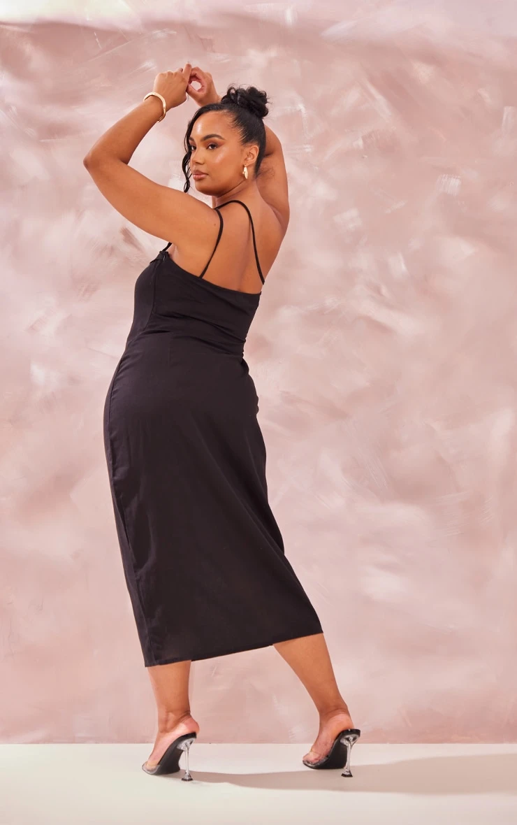 Your weekend look is calling out for some chic vibes and this plus black linen look asymmetric strap midi dress is here to solve your wardrobe dilemmas. Made from a black hue linen look material with an asymmetric strap design and a figure-flattering midi fit, what more could you ask for? Style this plus dress with clear strap heels and statement accessories for an occasion look like no other.