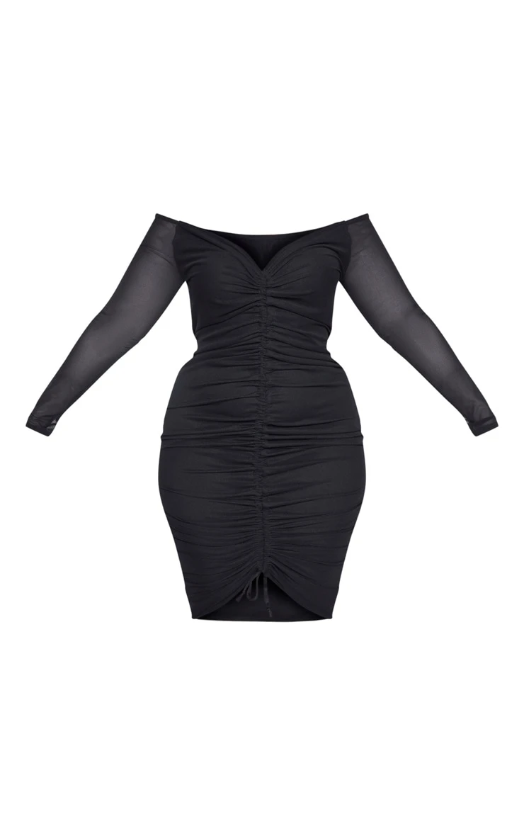 This simple mesh little black dress is sure to elevate your weekend wardrobe in style doll. Its the perfect pick for a black tie event. Featuring a black mesh lined material with sheer long sleeves, a bardot neckline and ruched detailing on the front we are obsessed. This mesh black long sleeve dress is sure to have heads turning, team it with some clear strappy heels and hoop earrings for a simple but chic look that you won’t regret.