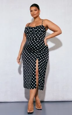 Take your weekend wardrobe to a whole new level with this unreal plus black polka dot ruched bust side split midi dress, it is perfect for your next upcoming occasion and beyond. This dress is made with a black material with a polka dot print design, ruched detailing and a side split style, it’s a definite yes from us. Wear with clear slip-on heels and your fave accessories for an effortlessly chic finish.