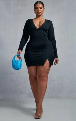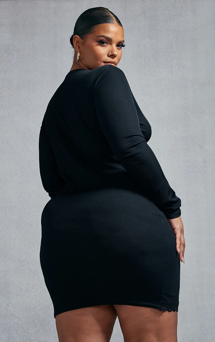 Every doll needs a little black dress in their wardrobe and this plus black rib lace detail split hem bodycon dress is sure to bring all the attitude. Get ready to have all eyes on you. This plus dress features a black rib material with lace detailing and a split hem design, what’s not to love? Style with clear slip-on heels, hoop earrings and a mini bag for the ultimate glam finish.