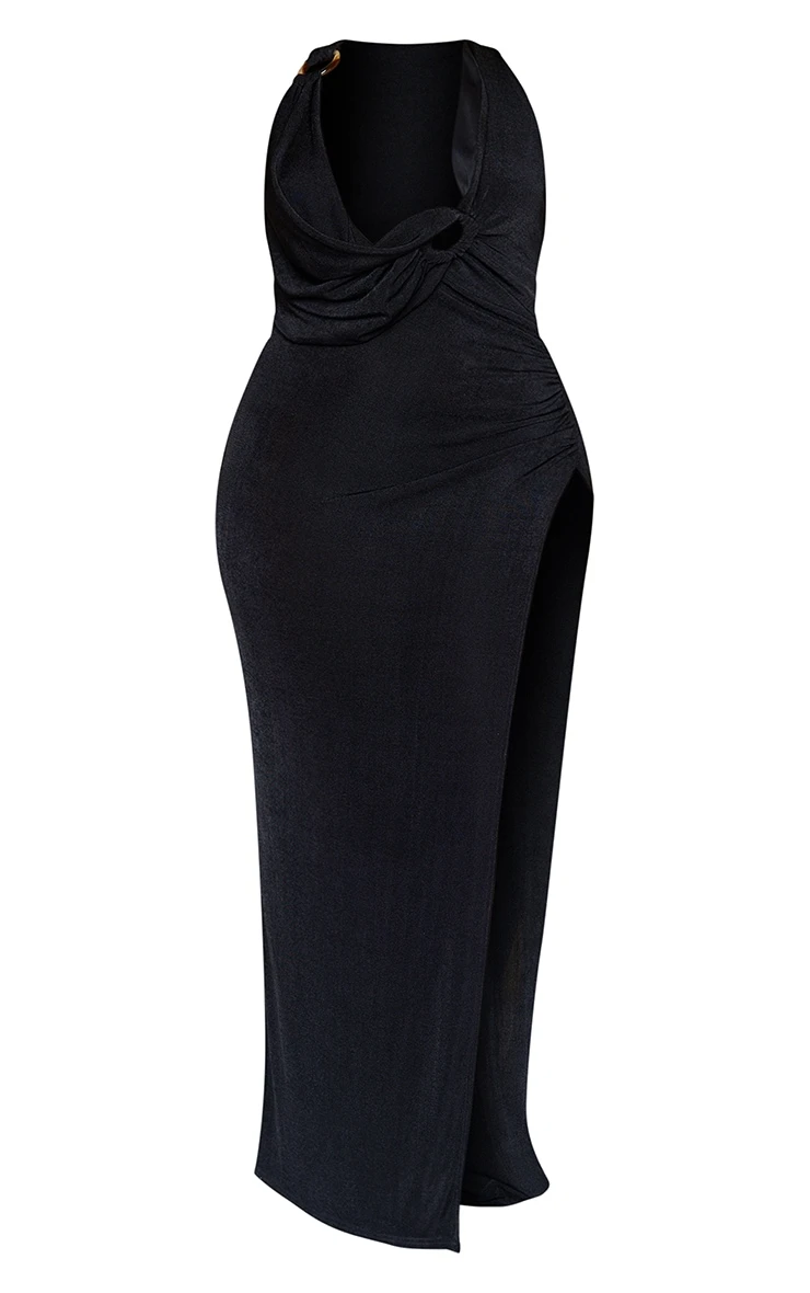 Have heads turning for all the right reasons in this show-stopping dress. Featuring a black material with a ring detail and a thigh split design. For a fiercely feminine look we’re loving just add strappy heels and hoop earrings