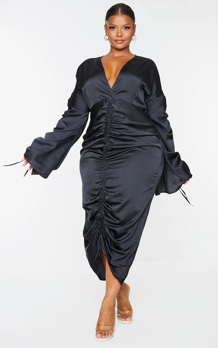 Get ready to steal all the stares in this dress doll. Featuring a black satin material with a ruched design and a plunge neckline. Style with clear strap heels and your fave accessories for a dreamy date night look.