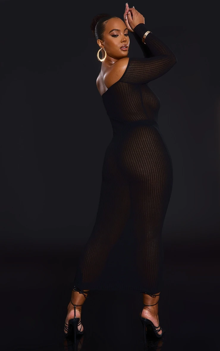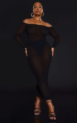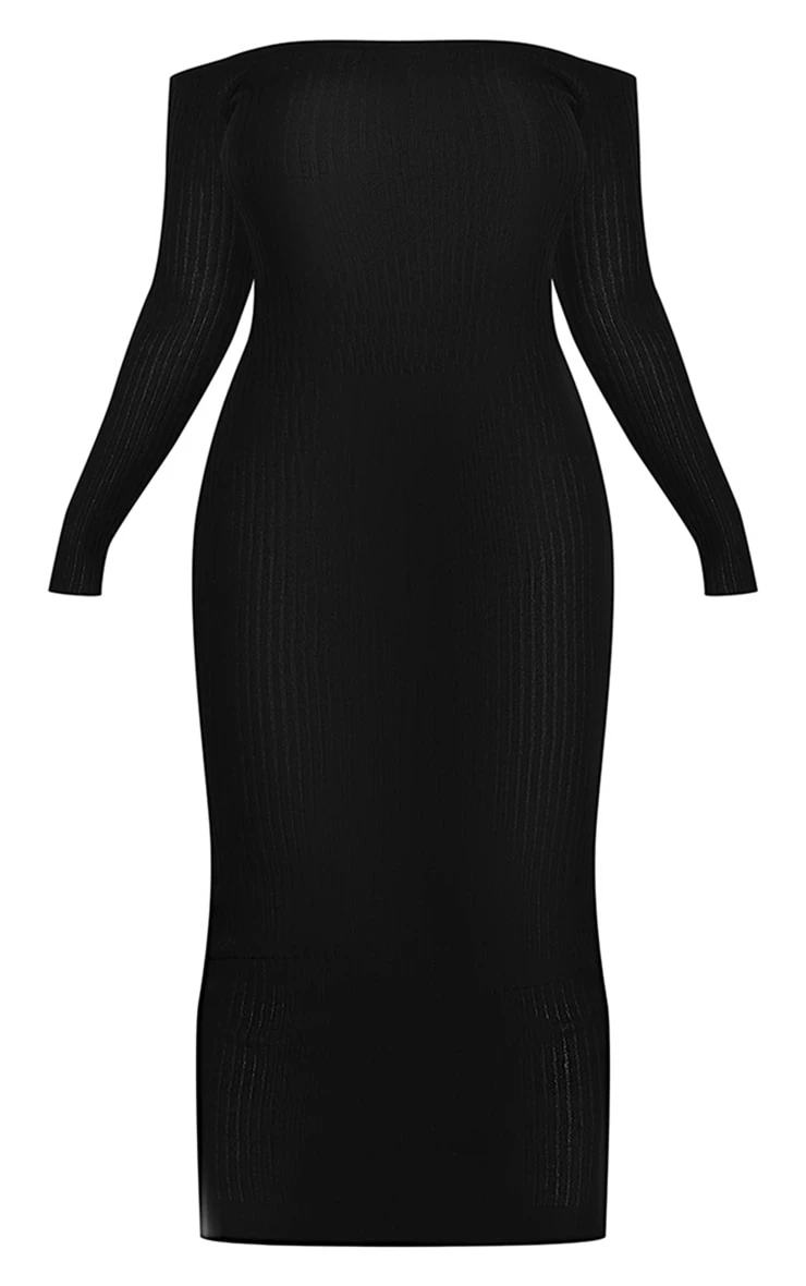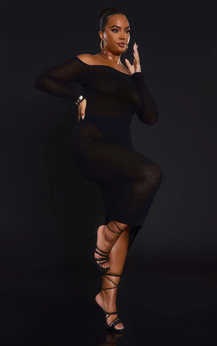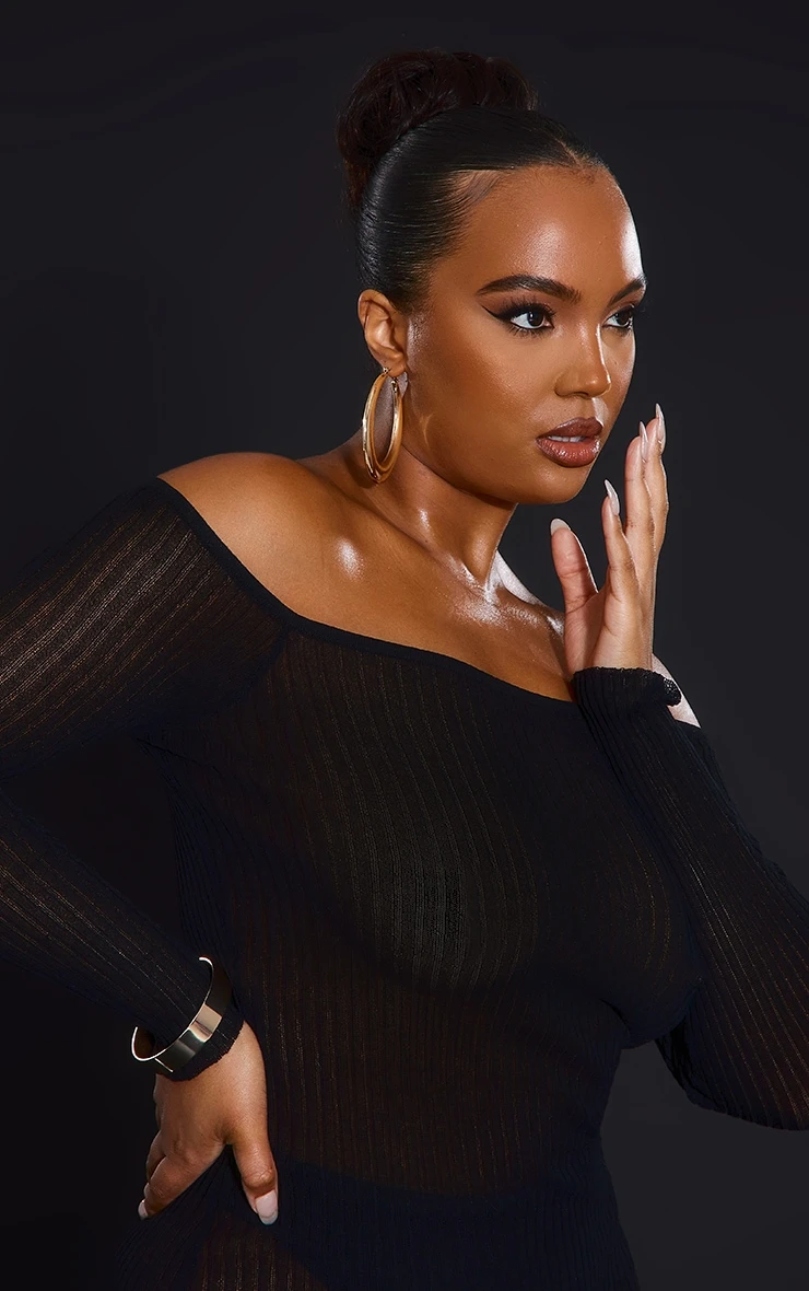 This dress is sure to add a little attitude to your new season wardrobe. Featuring a black sheer knit material with a bardot neckline and a midi length. Team with tie-up heels and gold hoop earrings to have all eyes on you.