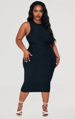 Make your weekend styling simple with this plus black soft touch racer neck bodycon dress. Brought to you in a black soft touch material with a racer neck and a figure-hugging fit to hug you in all the right places. This plus women’s body dress is your new season saviour. Style effortlessly with white high heels and accessories for a glam finish.