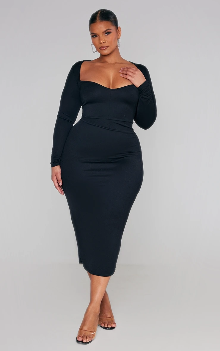 Take your collection to a whole new level with this unreal midi dress. Featuring a black material with a sweetheart neckline, long sleeves and a figure-enhancing fit, we are so in love. Team with high heels, accessories and a shoulder bag for a vibe that won’t go unnoticed.