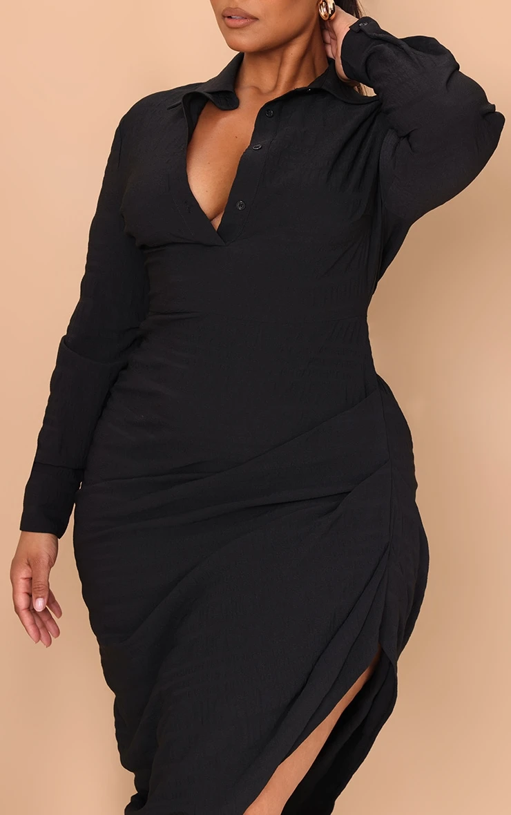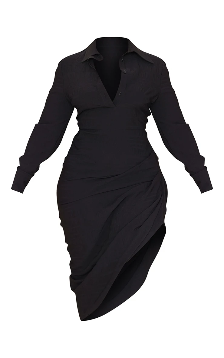 This dress is giving us all the luxe vibes for your weekend wardrobe. Featuring a black textured material with a ruched side design and a midi length. We love this paired with tie-up heels and your fave accessories.