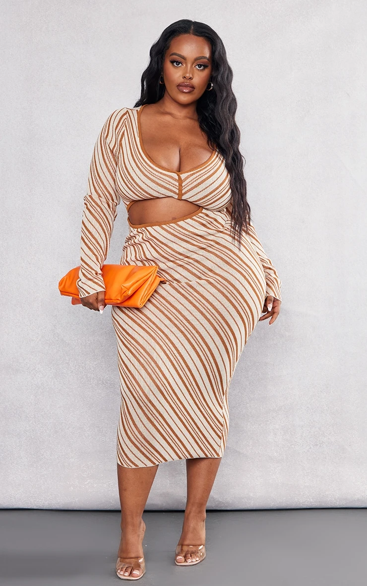 This plus brown stripe cut out midi dress is perfect for you and your collection this season. Made using a brown stripe print material with a figure-flattering fit that is perfect for showing off those curves, what more could you ask for? Be sure to make some room in your wardrobe. Style effortlessly with high heels, staple accessories and a clutch bag for the perfect look that will get everyone talking.
