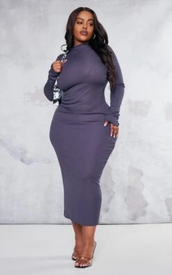 Your weekend fit is finally sorted with this midaxi dress doll. Featuring a charcoal rib material with a lettuce hem and long sleeves. Style with clear heels and a shoulder bag to complete this effortlessly chic look.