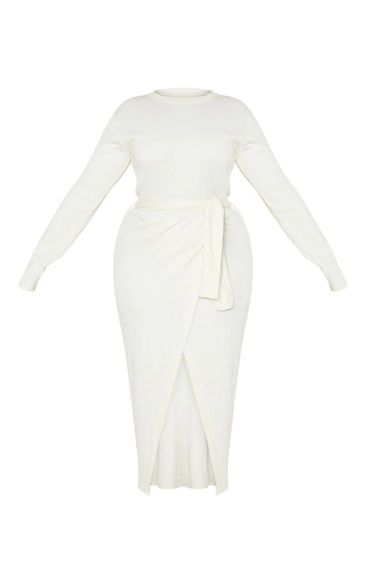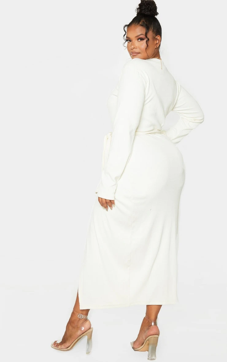 Give your new-season look a simple update with this midi dress. Featuring a cream thick ribbed material with a tie waist, long sleeves and a wrap over design. Style this with barely-there heels and a shoulder bag to complete the look.