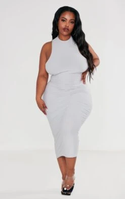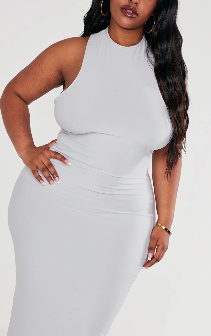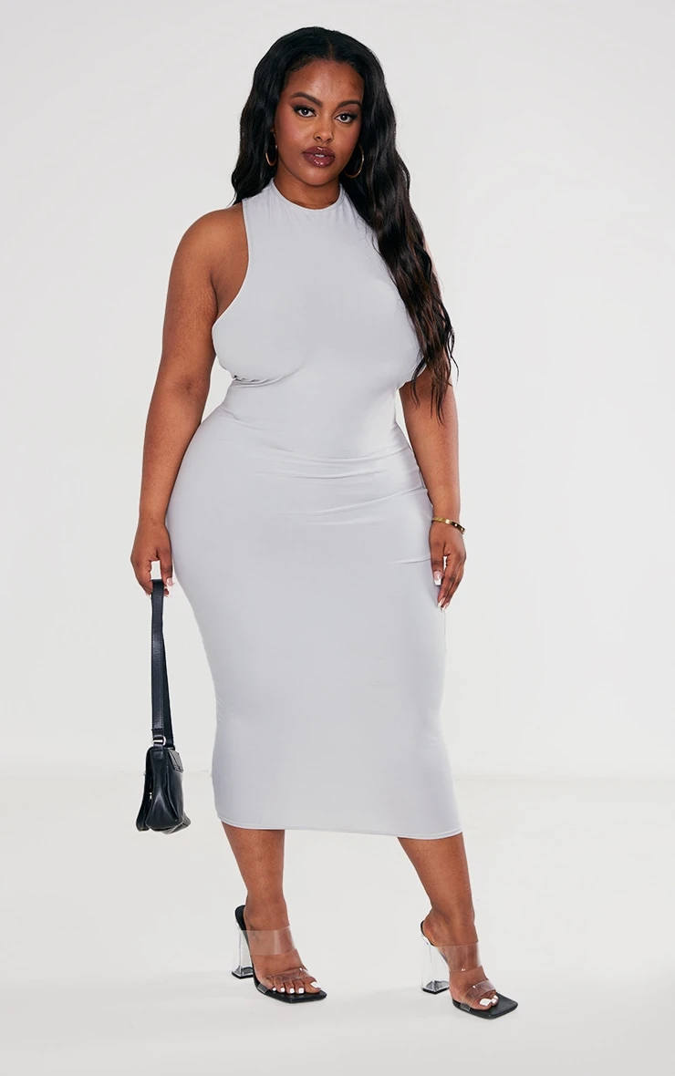 Amp up versatile vibes in your wardrobe with this plus grey soft touch racer neck bodycon dress. This dress is made from a grey hue soft-touch material with a racer neck and a figure-enhancing fit that will have you turning heads for all the right reasons, how could you say no? This women’s dress will earn you all the likes. Team with some clear heels for a simple but chic look, and minimal accessories.
