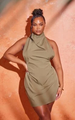 Get ready for the weekend with this plus khaki high neck cowl backless bodycon dress. Brought to you in a khaki hue material with a high cowl neck and a backless design, how could you resist? This plus bodycon dress is the touch of glam that your wardrobe is missing and needs to head straight to your basket. Team with clear heels, a mini bag and gold accessories for a weekend-worthy finish.