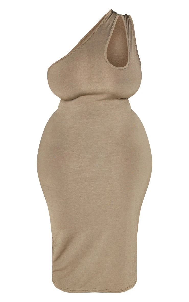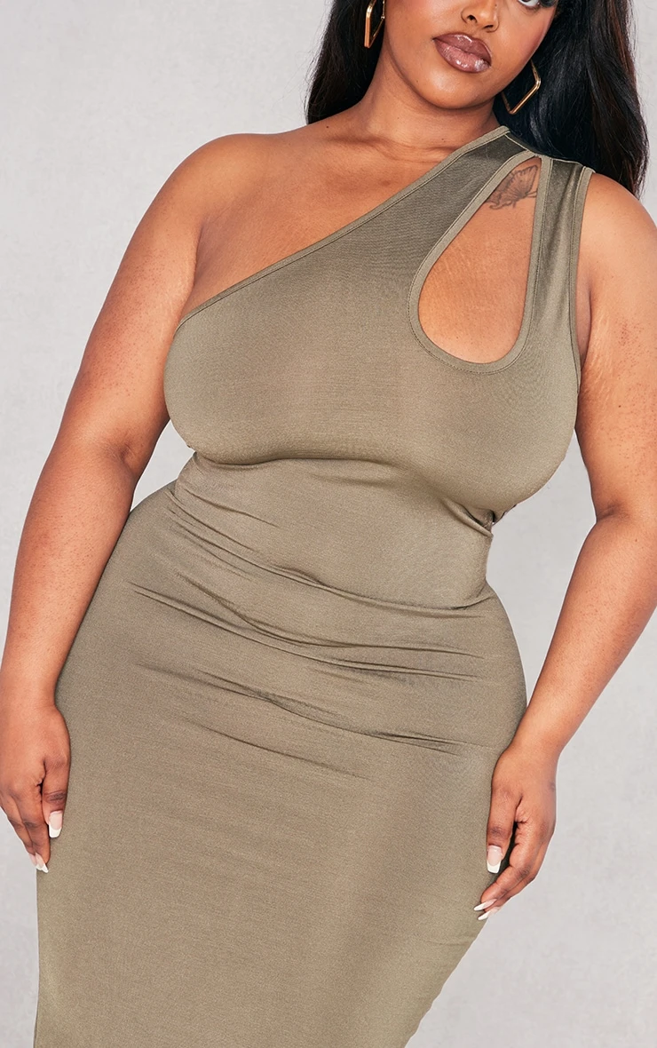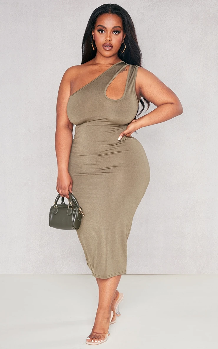 Your weekend wardrobe dilemmas are finally solved with this plus khaki one shoulder cut out midi dress doll. Figure-flattering in all the right places, this midi dress is sure to have you looking and feeling confident all night long. This plus dress is made from a khaki hue material and features a one shoulder cut out design with a midi length. Simply style with clear strap heels and your fave mini bag to complete the look.