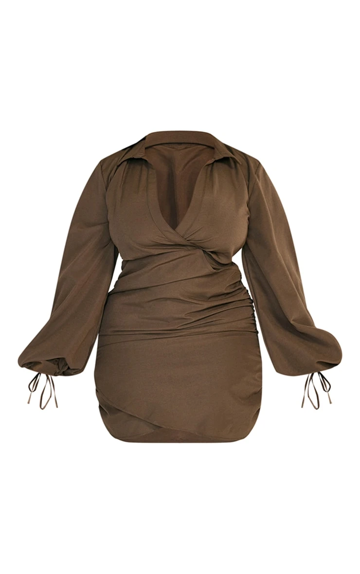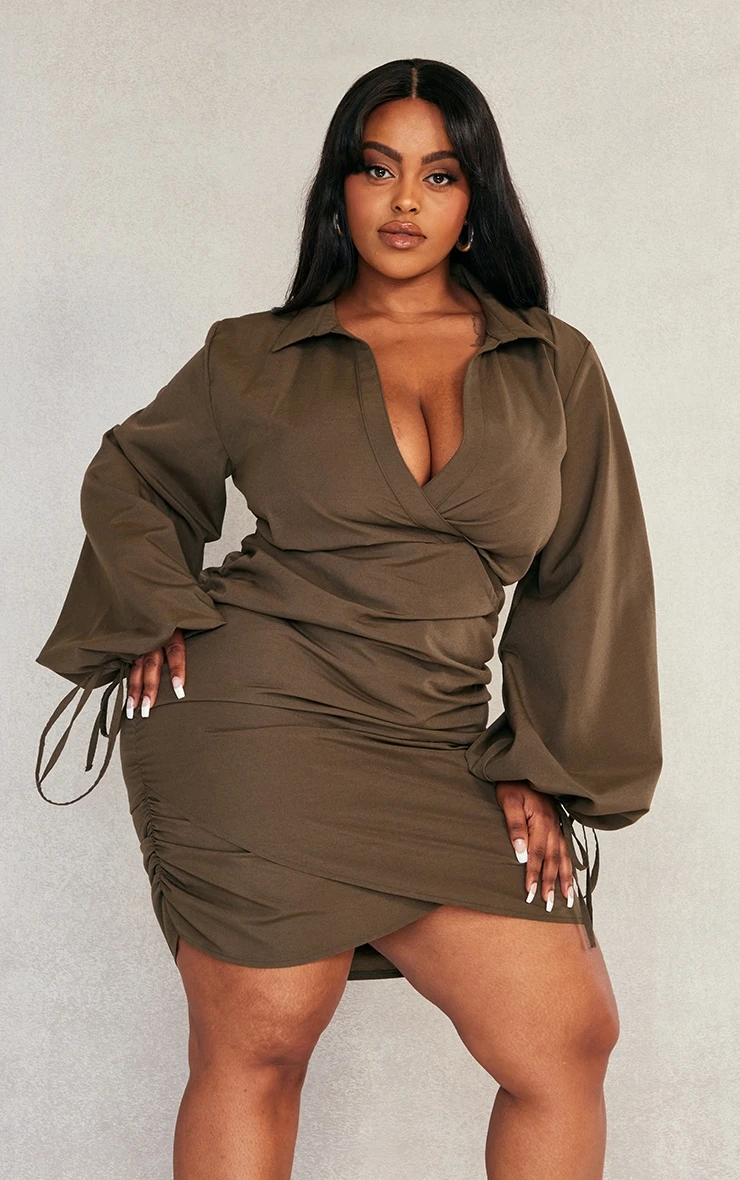 Inject some of this seasons must-have trends into your weekend wardrobe with this plus khaki plunge ruched tie cuff shirt bodycon dress which wont let you go unmissed. Brought to you in a khaki material with a plunge neckline and tie detailing how could you resist? With it’s figure-hugging fit you’re sure to have all eyes on you. Pair with tie up heels and gold accessories for a glam finish.