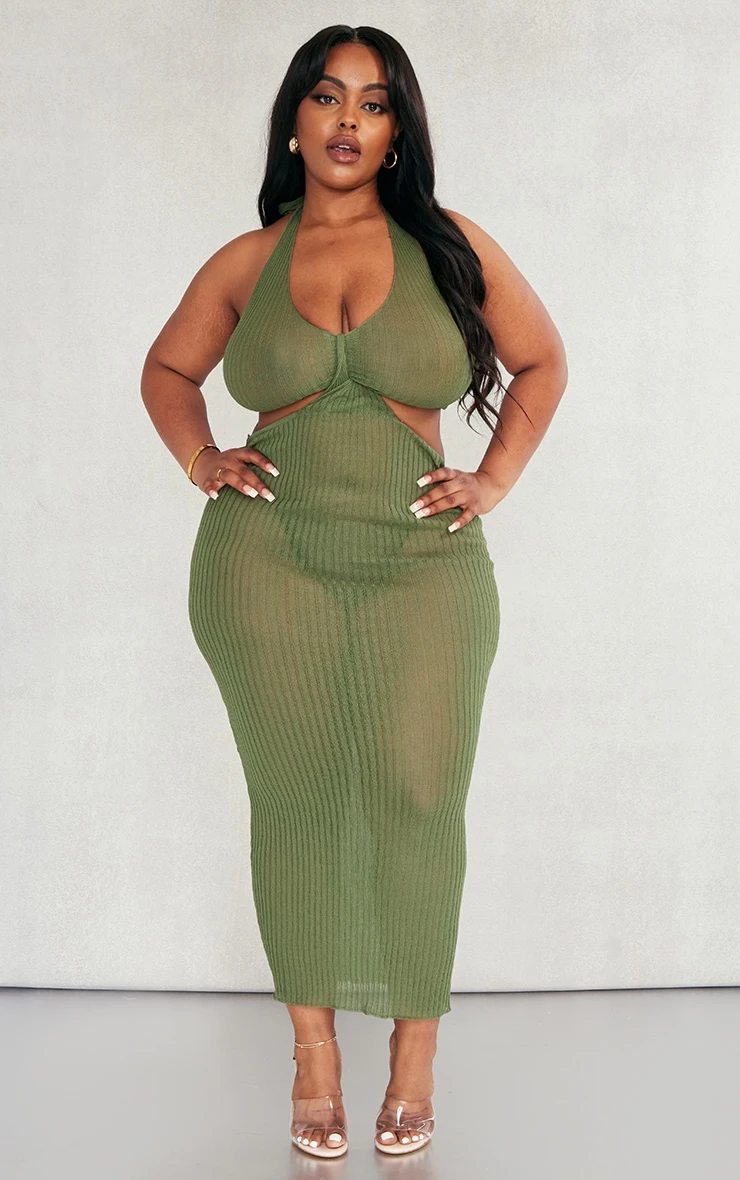Add a little attitude to your new season wardrobe with this plus khaki sheer knit cross halter neck midi dress, it is perfect for all your weekend plans. With a khaki sheer knit material, a cross halter design and a midi length, you are sure to fall in love with this plus dress. Wear with your fave high heels, a clutch bag and your biggest hoop earrings for the ultimate glam finish.