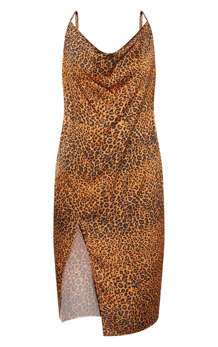 Add a fierce edge to your night out look with this must-have midi dress. Featuring a leopard print satin material, strappy detailing and a cowl neckline, team this with strappy heels for a killer look.