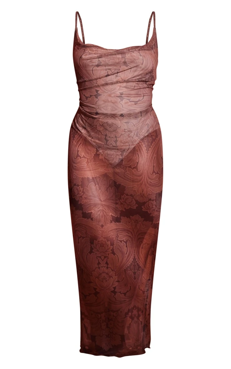 Your weekend outfit is finally sorted with this plus light brown floral print mesh cowl maxi dress. Brought to you in a light brown floral print mesh material with a cowl neckline and a figure-hugging fit, how could you say no? This plus maxi dress is sure to catch all the attention no matter what your occasion is. Team this plus maxi dress with your fave accessories and staple heels for a vibe that won’t go unnoticed.