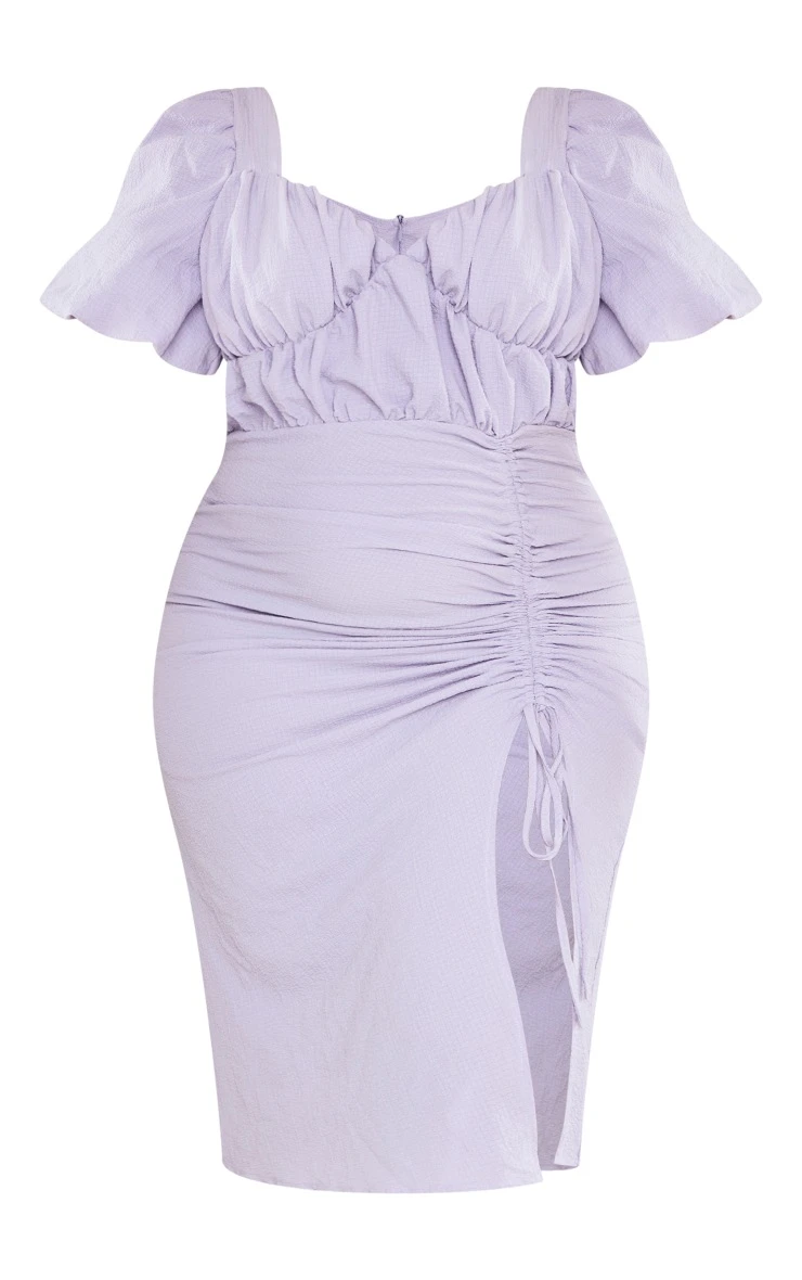 Bring the drama to your occasion look with this plus lilac puff sleeve ruched side split midi dress. Brought to you in a dreamy lilac hue material with puff sleeves, a ruched side design and side split detailing, how can you not fall in love? Style this midi dress with tie up heels and a matching hue mini bag for a look that is perfect for those weekend plans, your vacay wardrobe and beyond.