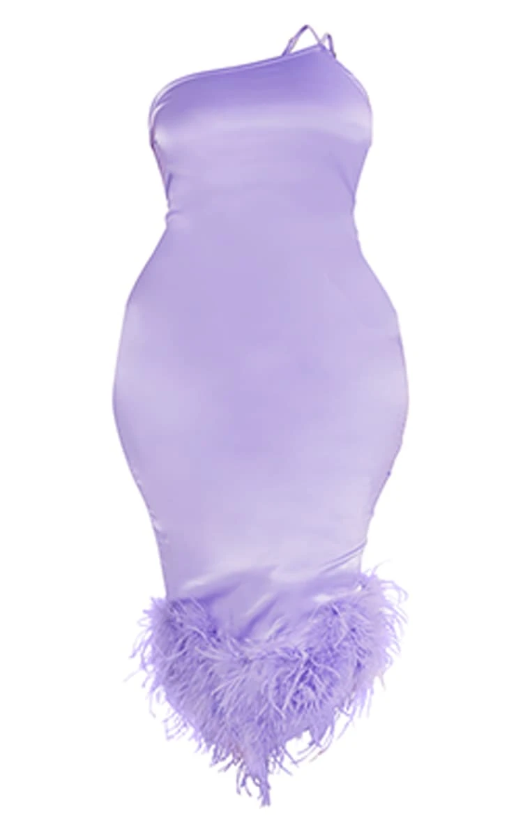 Inject some of this seasons must-have hues into your weekend wardrobe with this plus lilac satin feather trim one shoulder midi dress. This dreamy dress is brought to you in a satin material with a lilac hue along with a statement feather trim, a one shoulder design and a midi length, how could you say no to this? For a look that will leave everyone talking, pair this with your dreamy high heels and accessories for a weekend worthy combo.