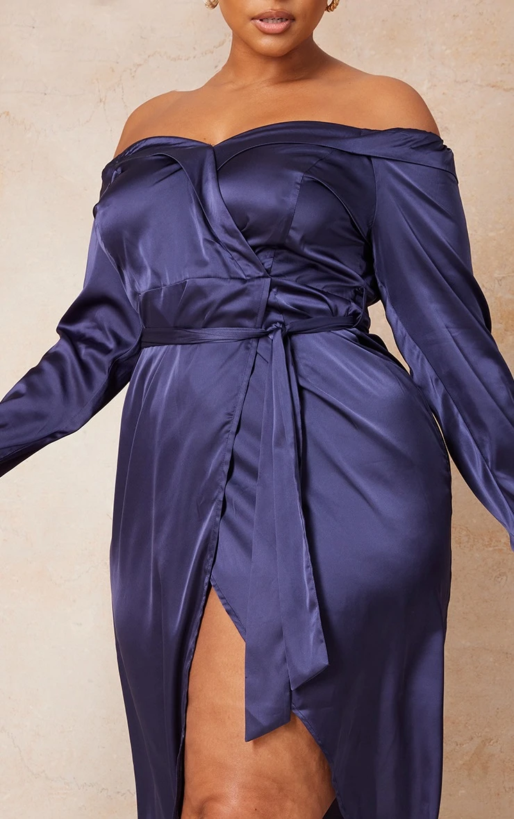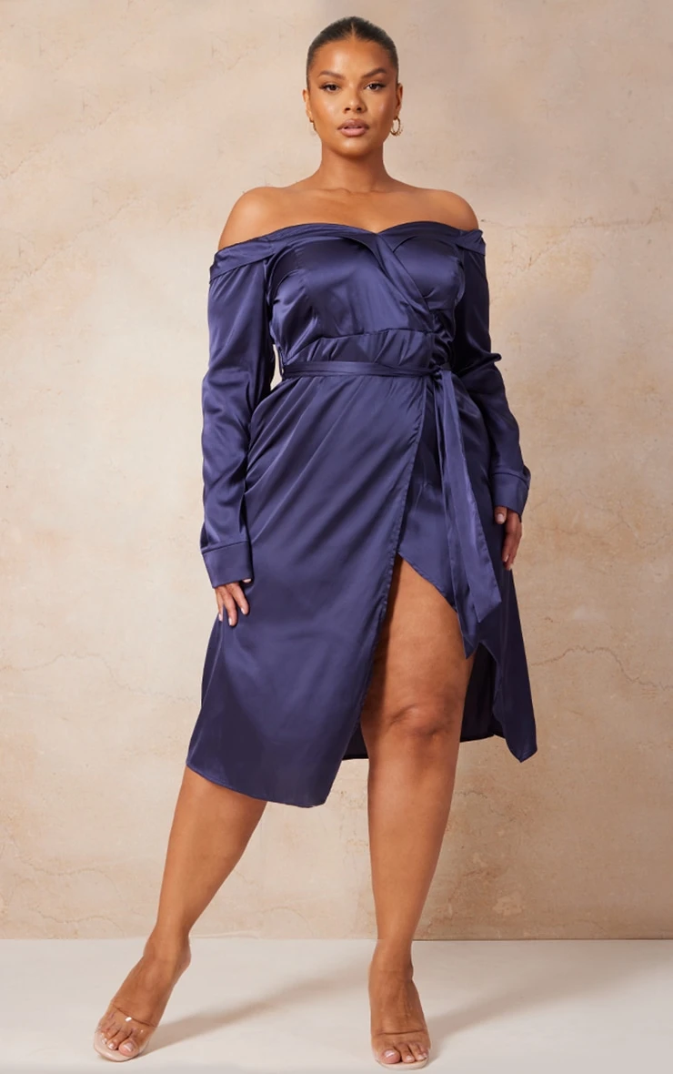 When the dress code calls for a touch of glam look no further. Featuring a navy satin material with a bardot design and wrap detail, we just cannot get enough. Take your look to the next level and style with heels and chic accessories.