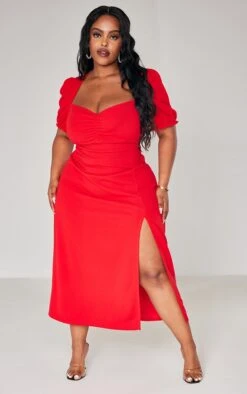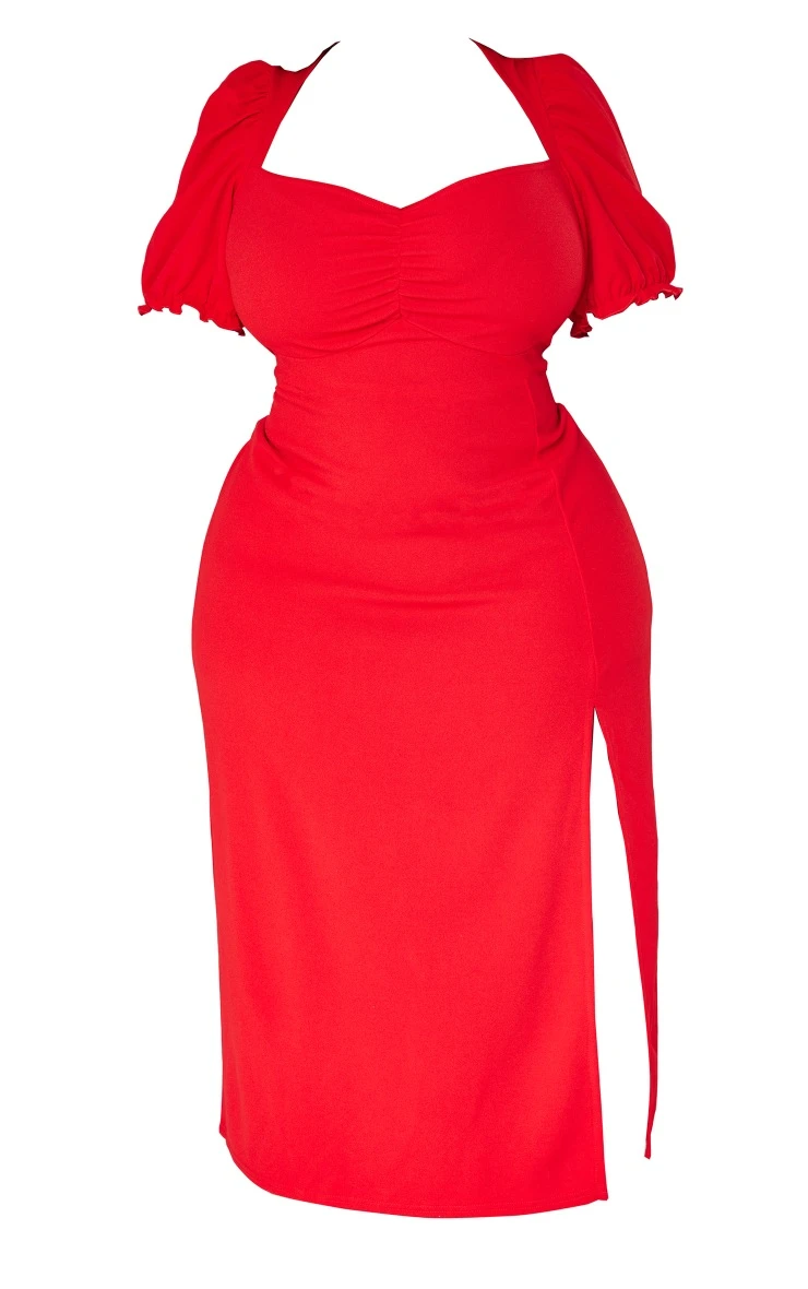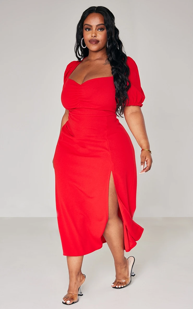 Turn up the heat on your weekend wardrobe with this dress. Featuring a red material with puff sleeves and a midi length. Style with clear heels and hoop earrings to have heads turning for all the right reasons.