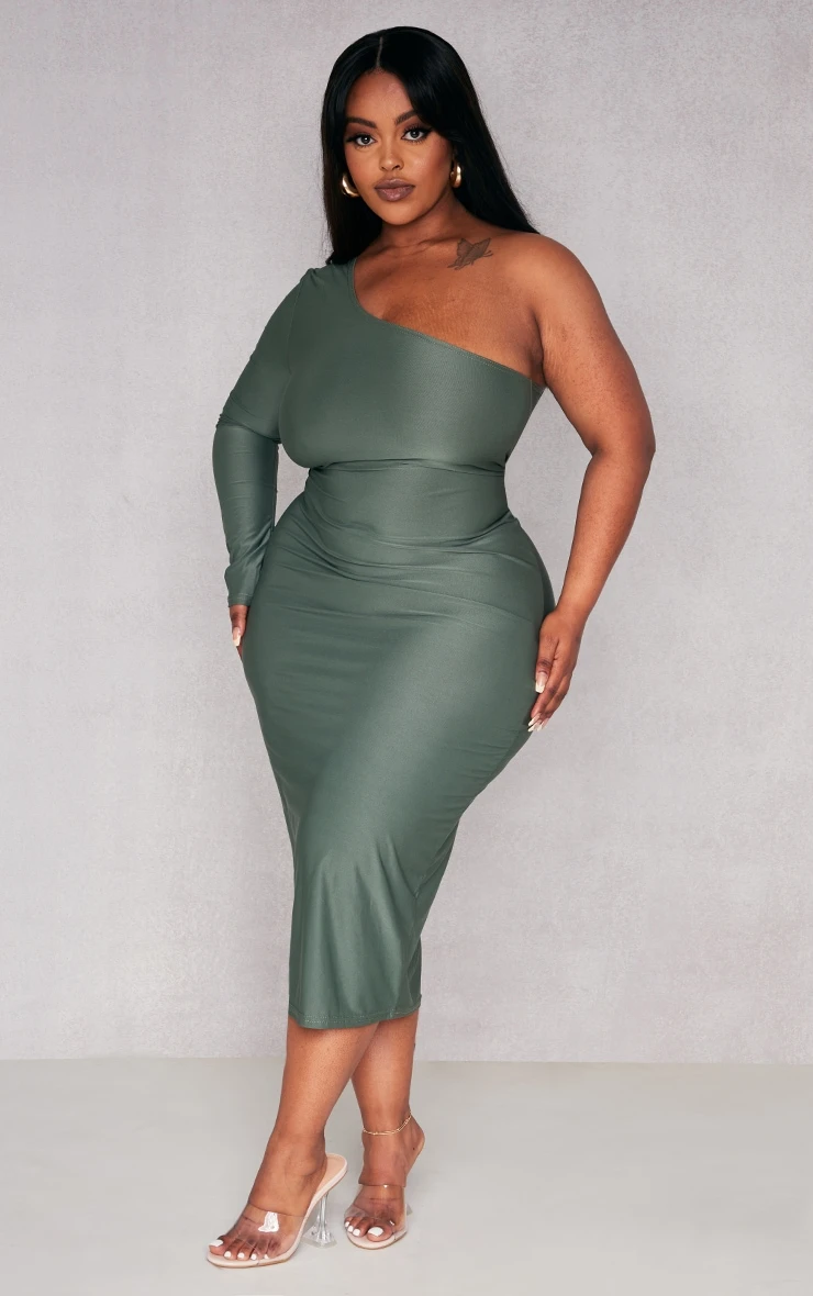 Get ready for the weekend with these plus sea green slinky one-shoulder midi dress and be sure to catch everyone’s attention. This plus midi dress is made from a sea green slinky material with a one-shoulder design and figure-hugging fit, it is sure to turn heads for all the right reasons. No matter what your plans are for the weekend, this plus dress is just what you need. Team with clear heels, gold accessories and a fiercely feminine vibe for a flawless finish.