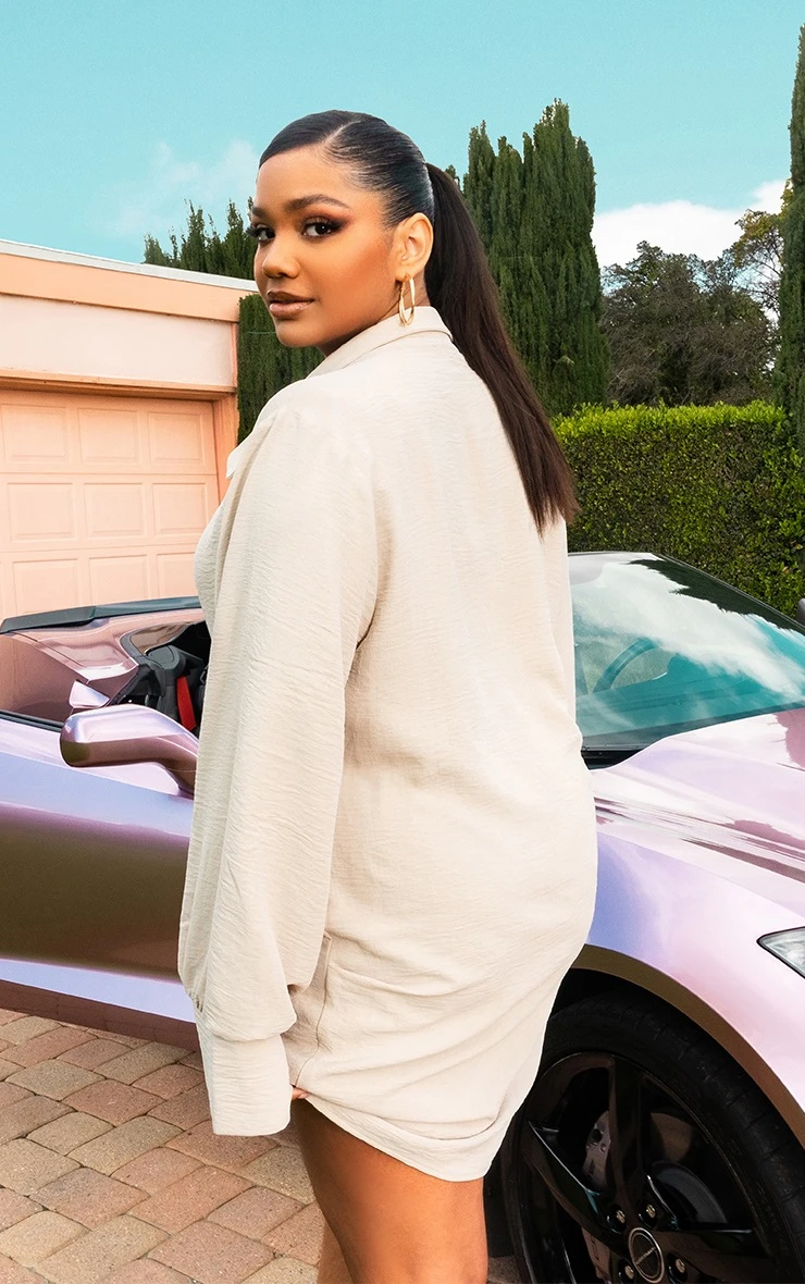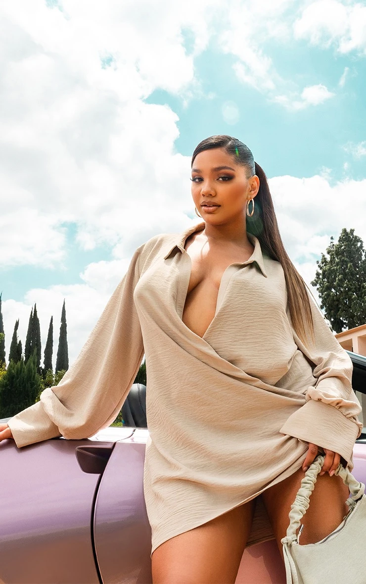 Take your weekend wardrobe to a whole new level with this plus stone plunge ruched tie cuff shirt bodycon dress. Its stone hue material is so on trend right now and its ruched detailing is super flattering. This plus shirt bodycon dress also features a plunging neckline which is sure to get you noticed for all the right reasons. No matter what your plans are doll, add heeled mules and a shoulder bag for a flawless finish.