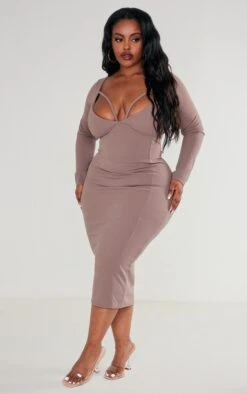 Give your weekend wardrobe a refresh this season with this plus taupe strap detail long-sleeve midi dress. This plus midi dress will elevate your weekend look with its taupe hue material and strap detail. Its plunging neckline and bodycon fit flatters your figure and will help embrace your curves doll. We are loving this paired with clear heels, a mini bag and gold hoops.