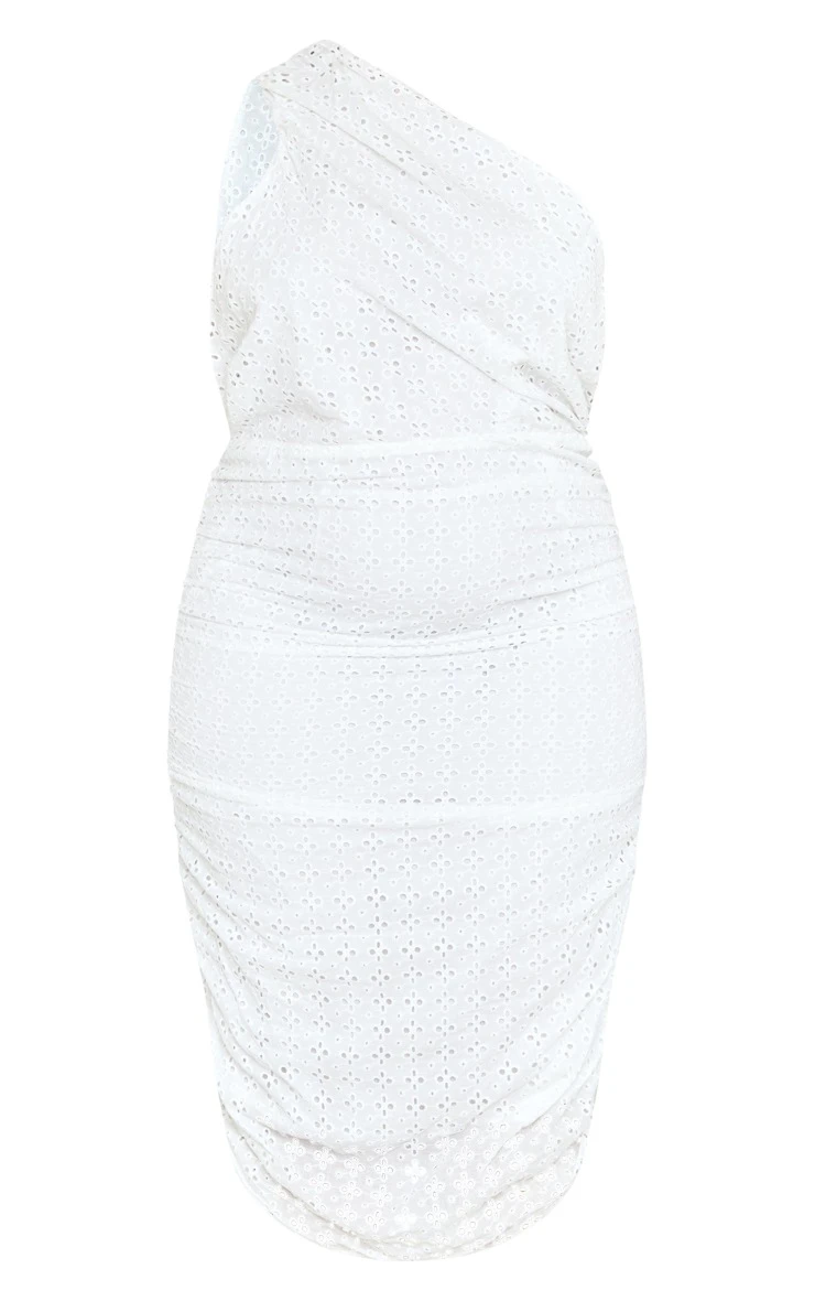 Step up your style game for the summer season with this plus white broderie anglais ruched midi dress doll. Its white broderie anglais material is so on trend this season and its one-shoulder design brings you that super chic touch. This plus midi dress also features ruched detailing that gives you a flattering fit that will gain all the compliments. Team with clear heels and gold accessories for a ‘fit worthy of that upcoming special occasion.