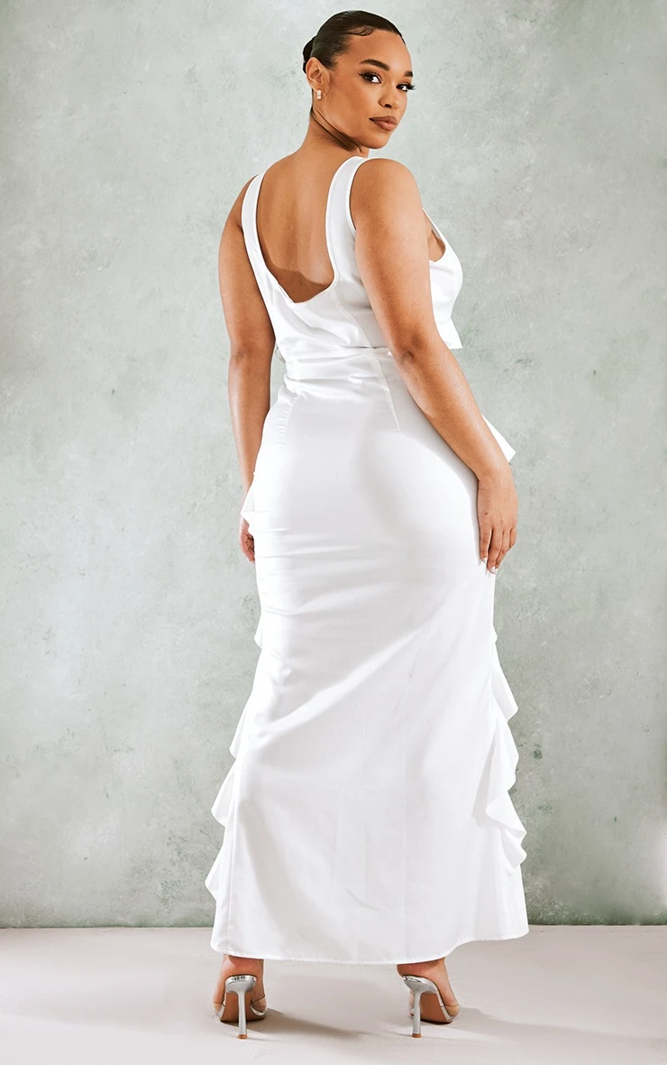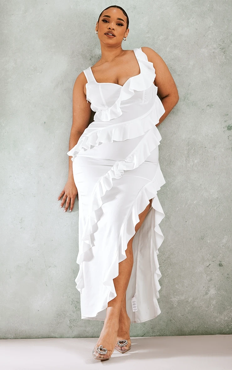 Get ready to have heads turning for all the right reasons in this effortlessly chic plus white satin frill layered midaxi dress. It is made with a white satin material with a frill layered design and a figure-flattering fit, what’s not to love? This plus midaxi dress is perfect for your next big event and beyond. Style it will your highest heels and hoop earrings for a look that everyone will be asking about.