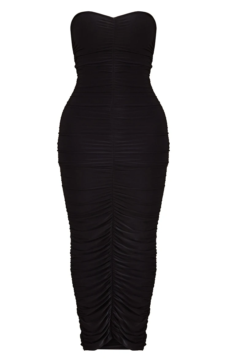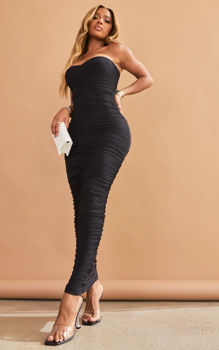 This midaxi dress is sure to give your weekend wardrobe a fierce update. Featuring a black ruched material with a bandeau neckline and a midaxi length, team it with some strappy heels for a seriously chic combo.