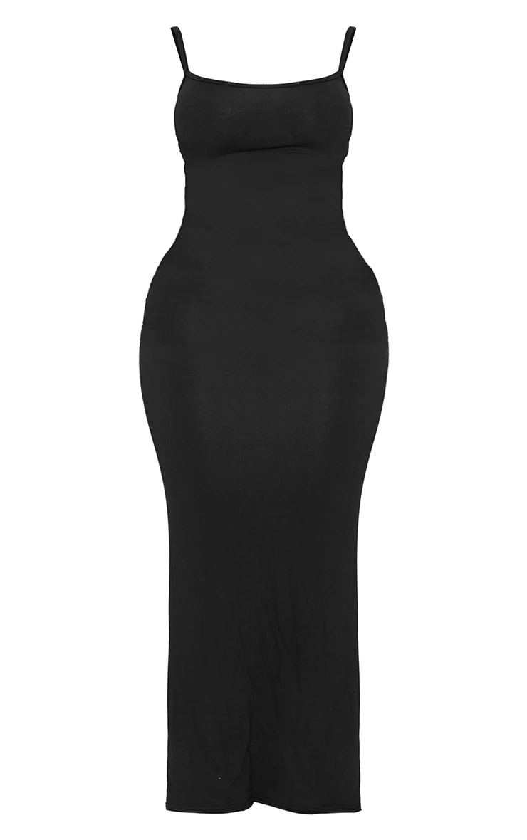 This dress is here to make a statement doll. Featuring a black jersey material with a strappy design and maxi length, we are obsessed. Pair with slip on heels and gold accessories to instantly elevate the look.