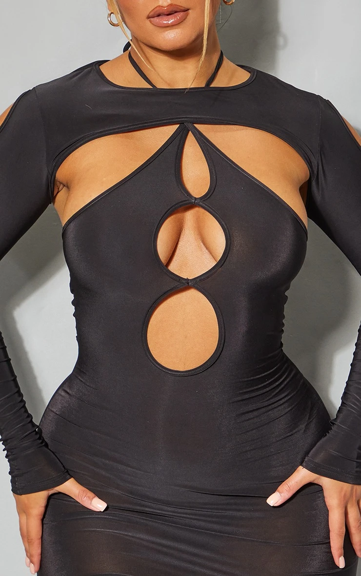 This dress is sure to bring some drama to your weekend wardrobe this season. Featuring a black slinky material with an overlay design and cut out detailing, we’re obsessed. Wear with strappy heels and hoop earrings for a look we’re loving right now.