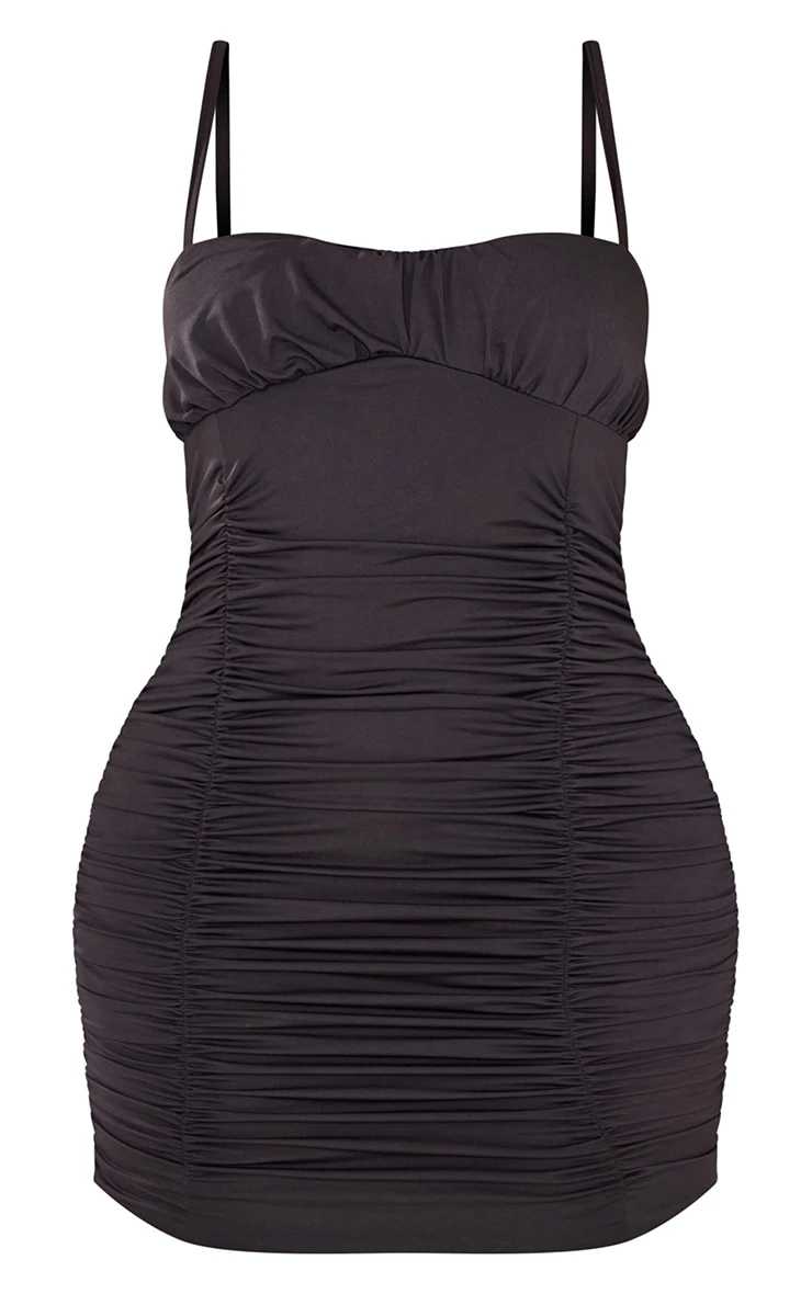 Take your little black dress collection to new heights with this dress. Featuring a black slinky material with extreme ruched detailing and a figure-hugging fit. Style this with barely-there heels for date night with your number one.