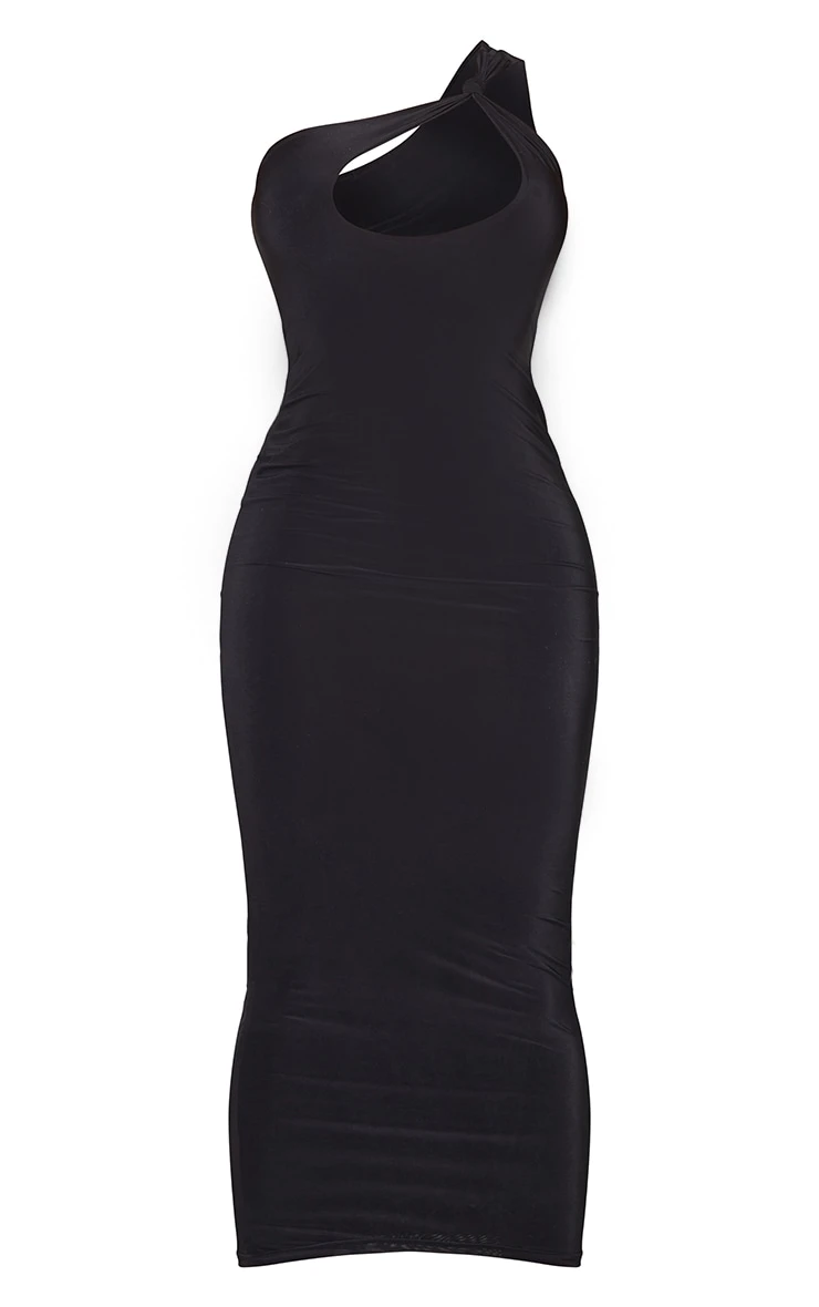 This midaxi dress is a new season essential doll. Featuring a black slinky material with a cut-out design and knot shoulder detailing. Style with barely-there heels and a clutch bag for an effortlessly put-together look.