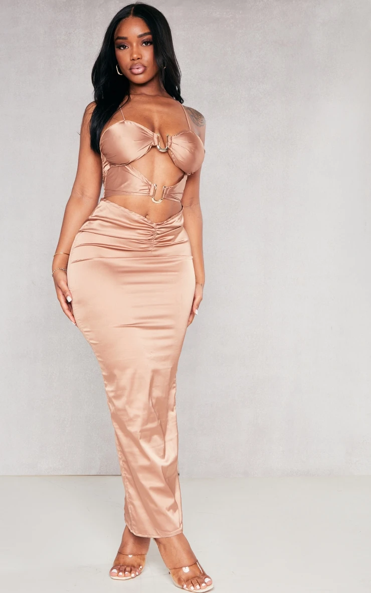 Get ready to have all the attention on you in this unreal shape bronze satin trim detail cut out midaxi dress, it is perfect for your weekend plans and beyond. This dress is made with a bronze satin material with a cut out design and a midaxi length, what’s not to love? Just add your fave high heels and simple accessories for the ultimate flawless finish everyone will be obsessing over.