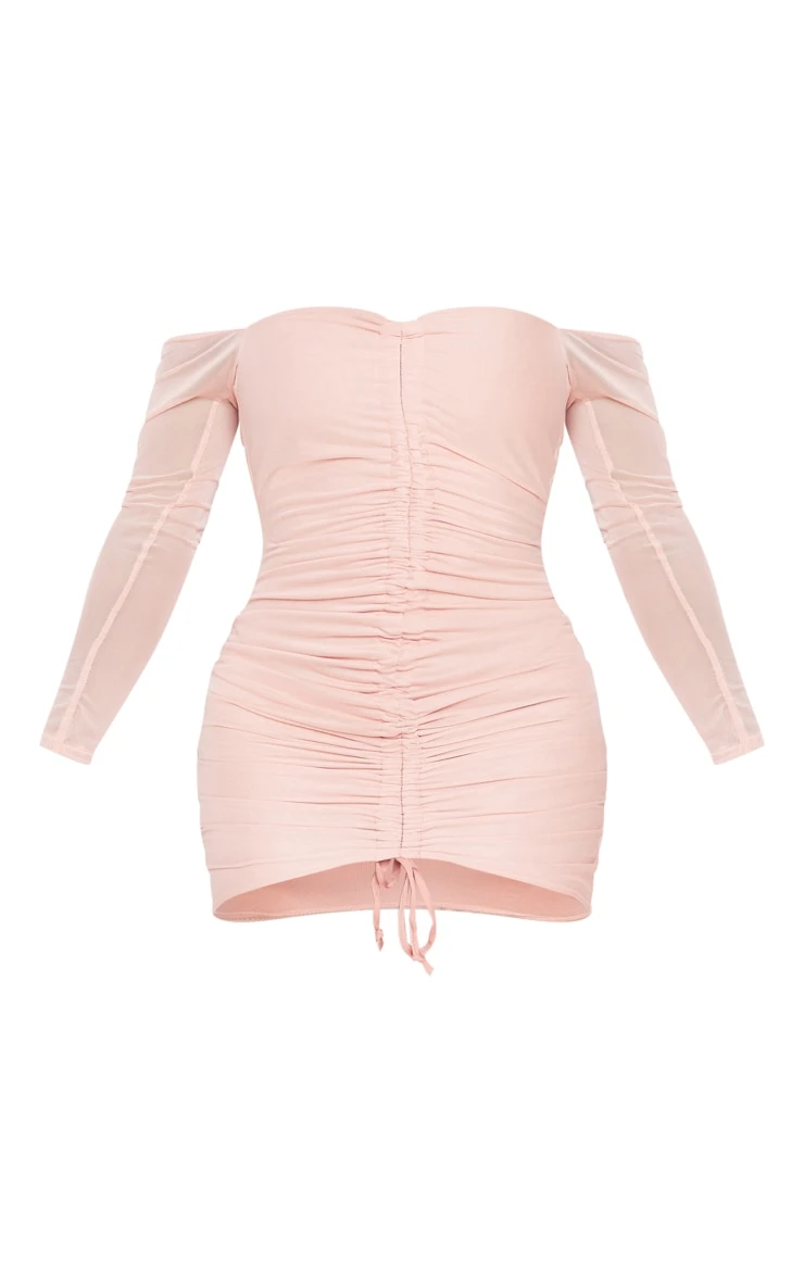 This dusty rose bardot dress is sure to give your weekend look an update. Featuring a dusty rose stretchy with mesh sleeves and ruched detailing, we are obsessed. Team it with some strappy heels for a night out with the dolls.