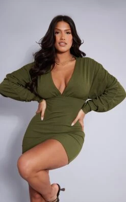 Get ready for the weekend with this shape khaki soft rib plunge ruched sleeve bodycon dress. Its khaki soft rib material brings all the luxe vibes to your look whilst its plunging neckline expresses your daring side. This shape bodycon dress has ruched sleeve detailing and a figure-hugging fit making it a perfect choice for your weekend plans. Keep your look simple but chic with heeled mules, statement accessories and a fresh vibe.