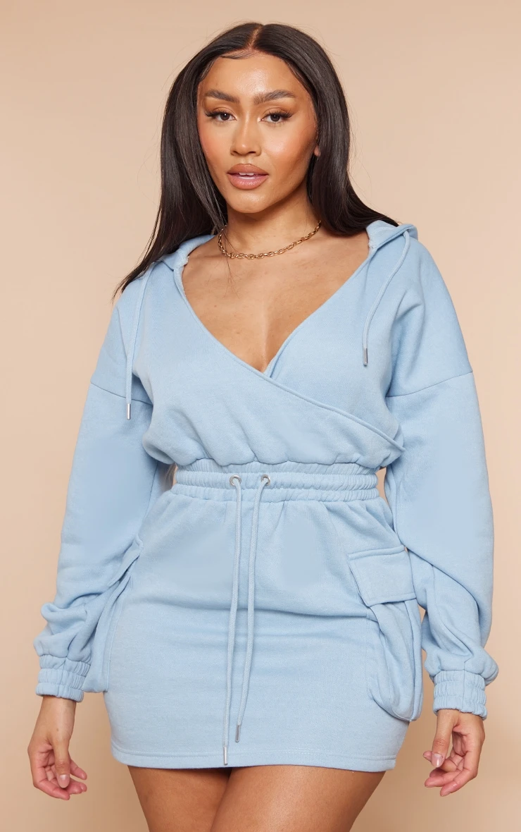 Make styling simple with this shape light blue plunge wrap utility pocket sweater dress. Effortlessly comfy and seriously on-trend for the new season, this dress is a must-have for those off-duty days and beyond. Made from a dreamy light blue hue material with a wrap design, a plunging neckline and utility pocket detailing, what’s not to love? Keep it casul and just add fresh kicks and your go-to accessories to complete the look.
